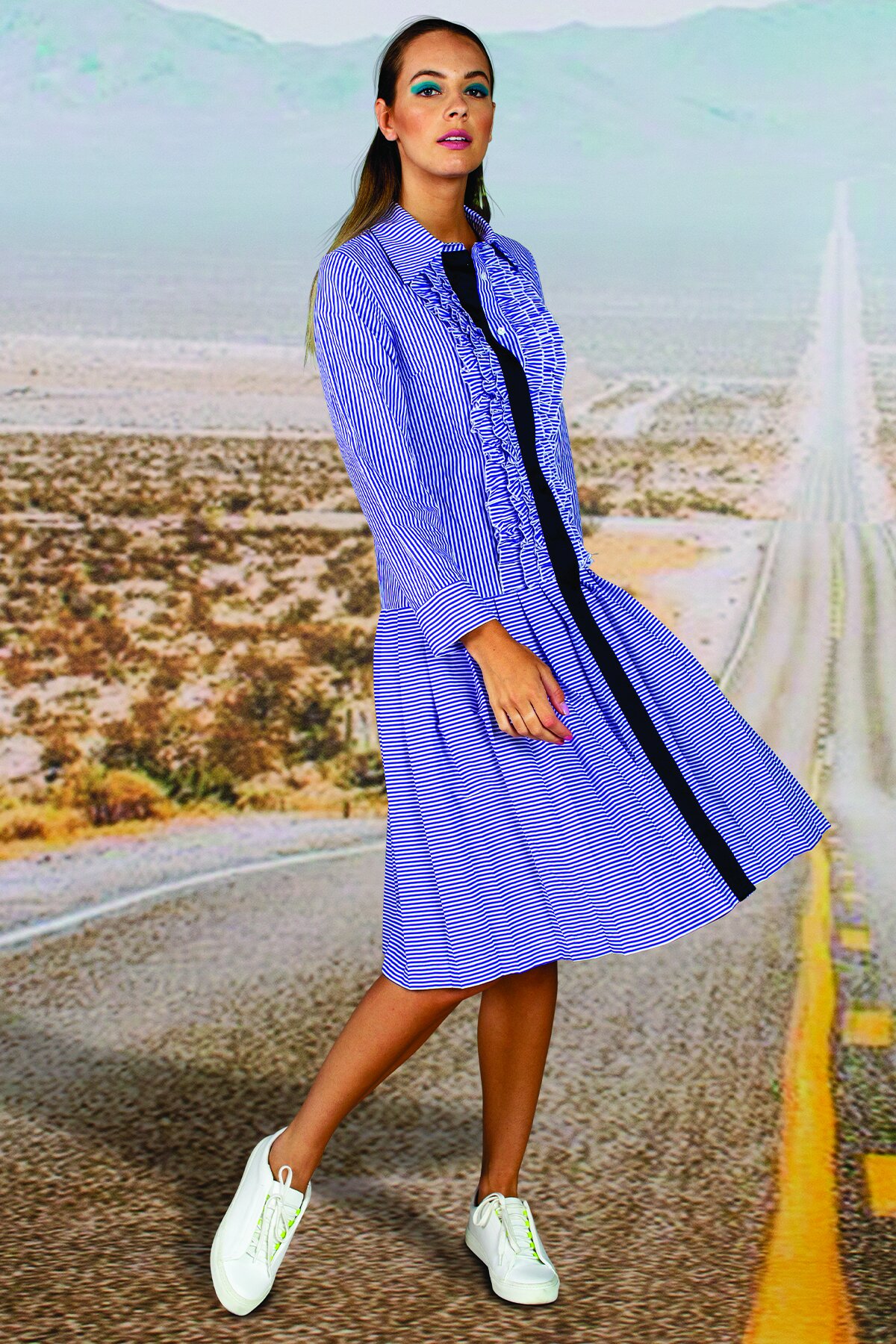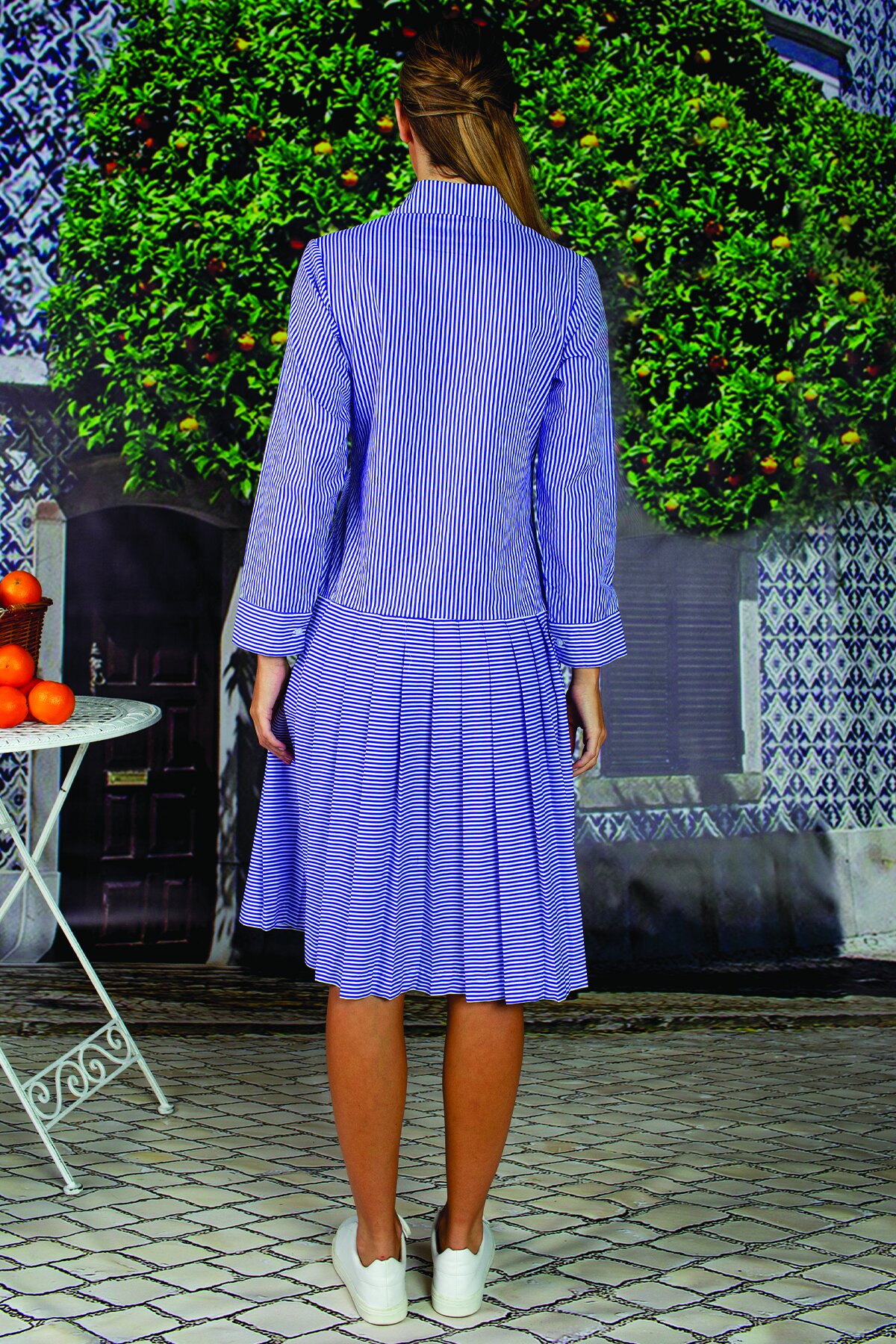 Designed in chic blue stripe cotton/poly shirting, this mid-length dress features navy ribbon detail and ruffles detail down the front. Also features a drop waist falling into a pleated skirt. We love this dress worn with sneakers for every day.