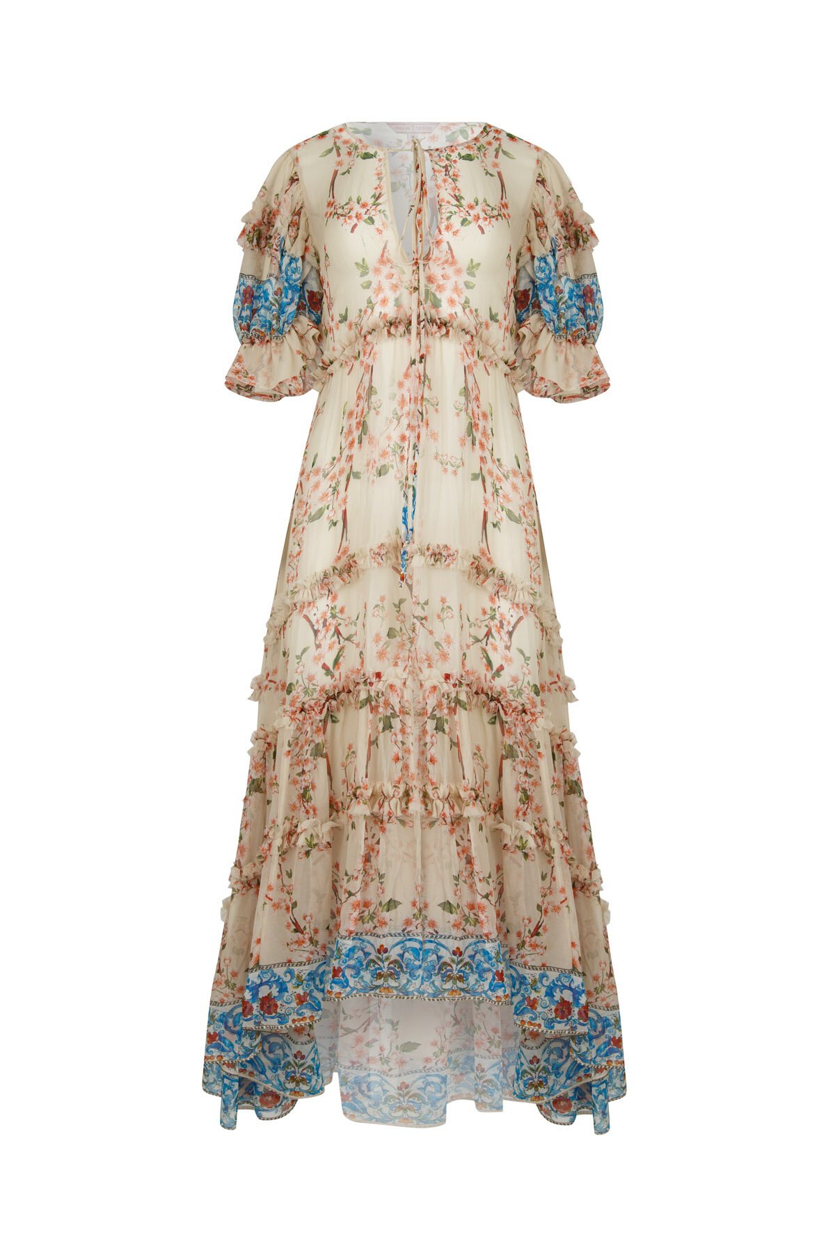 Beautiful silk georgette floral is just the Cherry On Top! Blush pink with hints of cherry blossom and a blue scroll border compliment each other beautifully. The ‘FRILLS ARE ALIVE’ dress is so romantic and pretty. Featuring a deep V-front with tie detail, statement puff sleeves that softly gather with ruffles and frills. Fitted under the bust, accentuated with soft tiers and frills and finished with the blue scroll border. Midi length at front with a longer hem at the back.