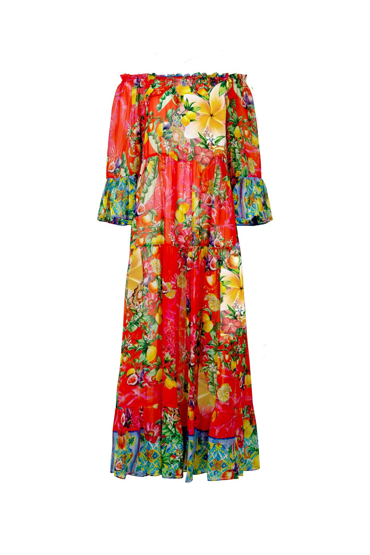 How cool is this print! Featuring a little bit of leopard and a whole lot of flowers! ‘WATERMELON SGAR HIGH’ dress has a softly elasticated gathered neckline that can be worn low across the shoulders or up into a scoop neck. With an easy fitting body shape that flatters the maxi length. Featuring a deep frill hem and sleeve with border print in beautiful floaty georgette.