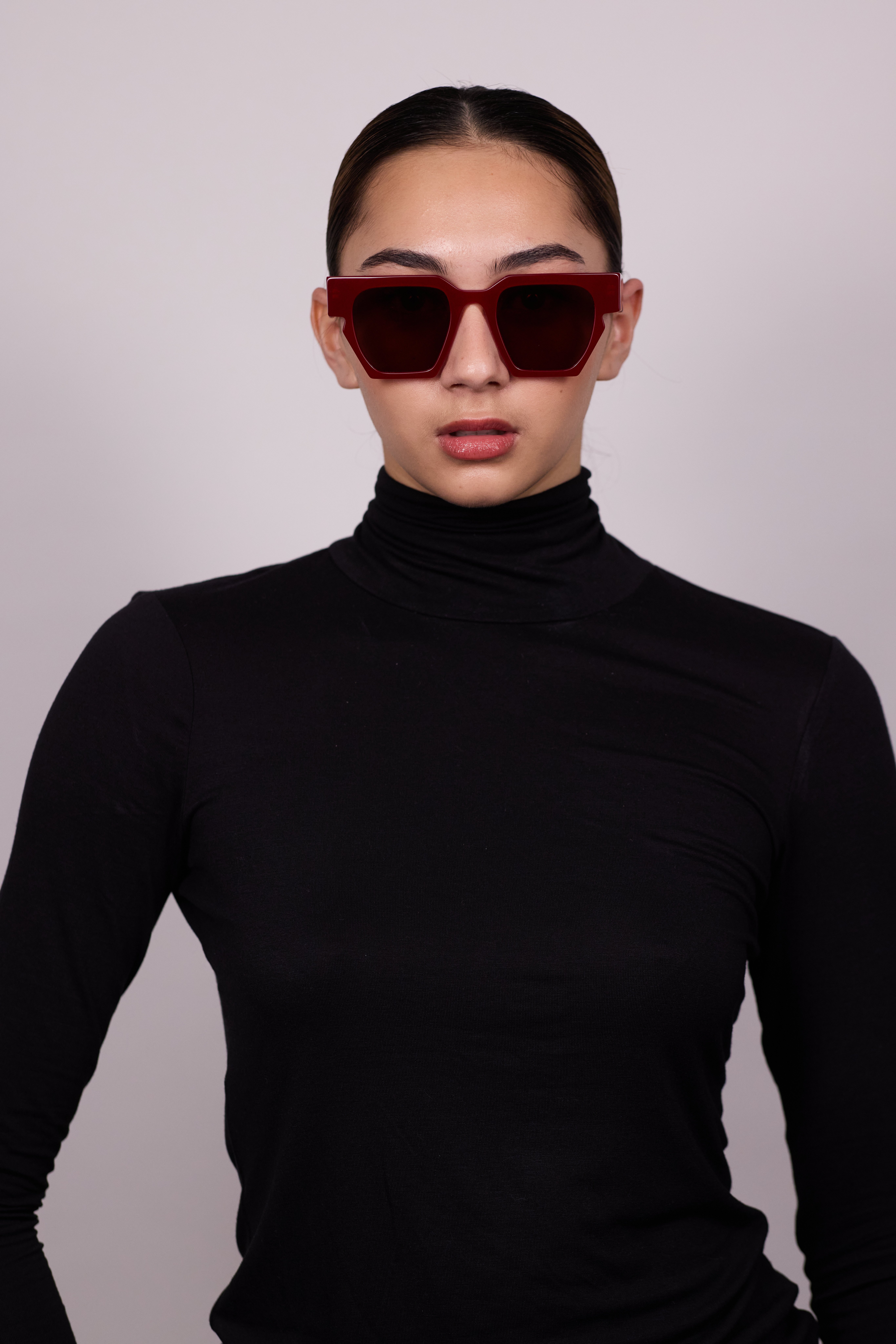 Utilising the flat top forming into smooth curves and triangle cutout details on front frame and temple of Triage we have enlarged it to make this bold statement frame, in turn paying Homage to Triage.