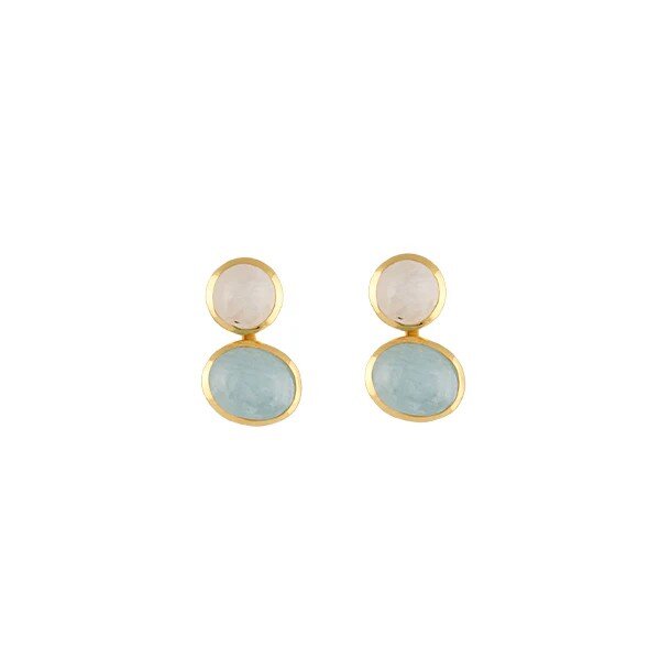 The Motif Earrings by Bianc feature a soft pairing of serene Rainbow Moonstone and Milky Aquamarine gemstones set in 18k gold plated sterling silver. The dual-stone design creates subtle movement and a graceful silhouette that feels both modern and timeless. Perfect for adding a gentle hint of colour to your everyday wardrobe or special occasions.