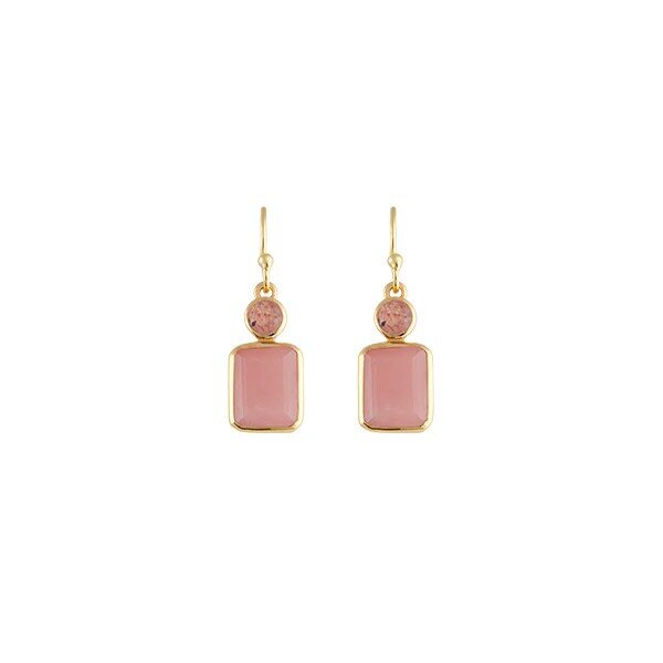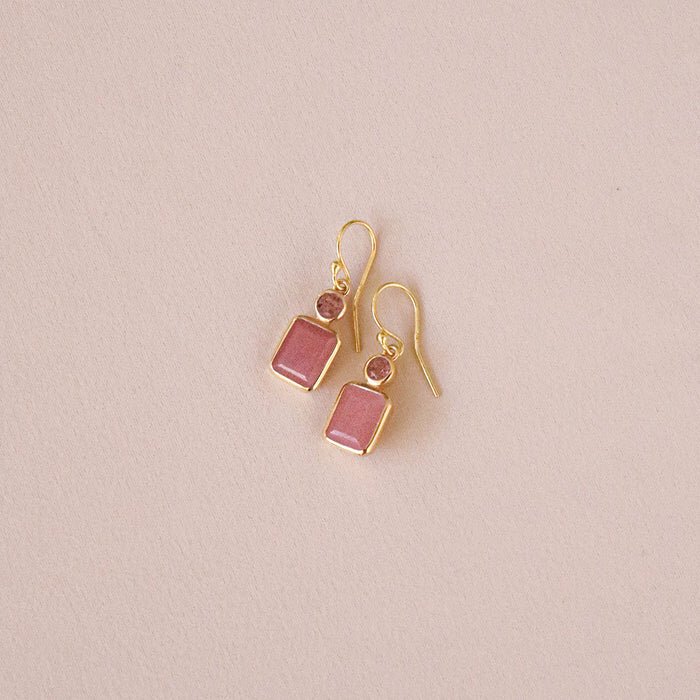 The Rosie Earrings by Bianc feature a round Strawberry Quartz gemstone paired with a rectangular Guava Quartz stone drop, set in 18k gold plated sterling silver. The feminine tones and clean lines make these earrings a refined yet playful choice. Light enough for all-day wear, they’re perfect for everything from brunch to special occasions.