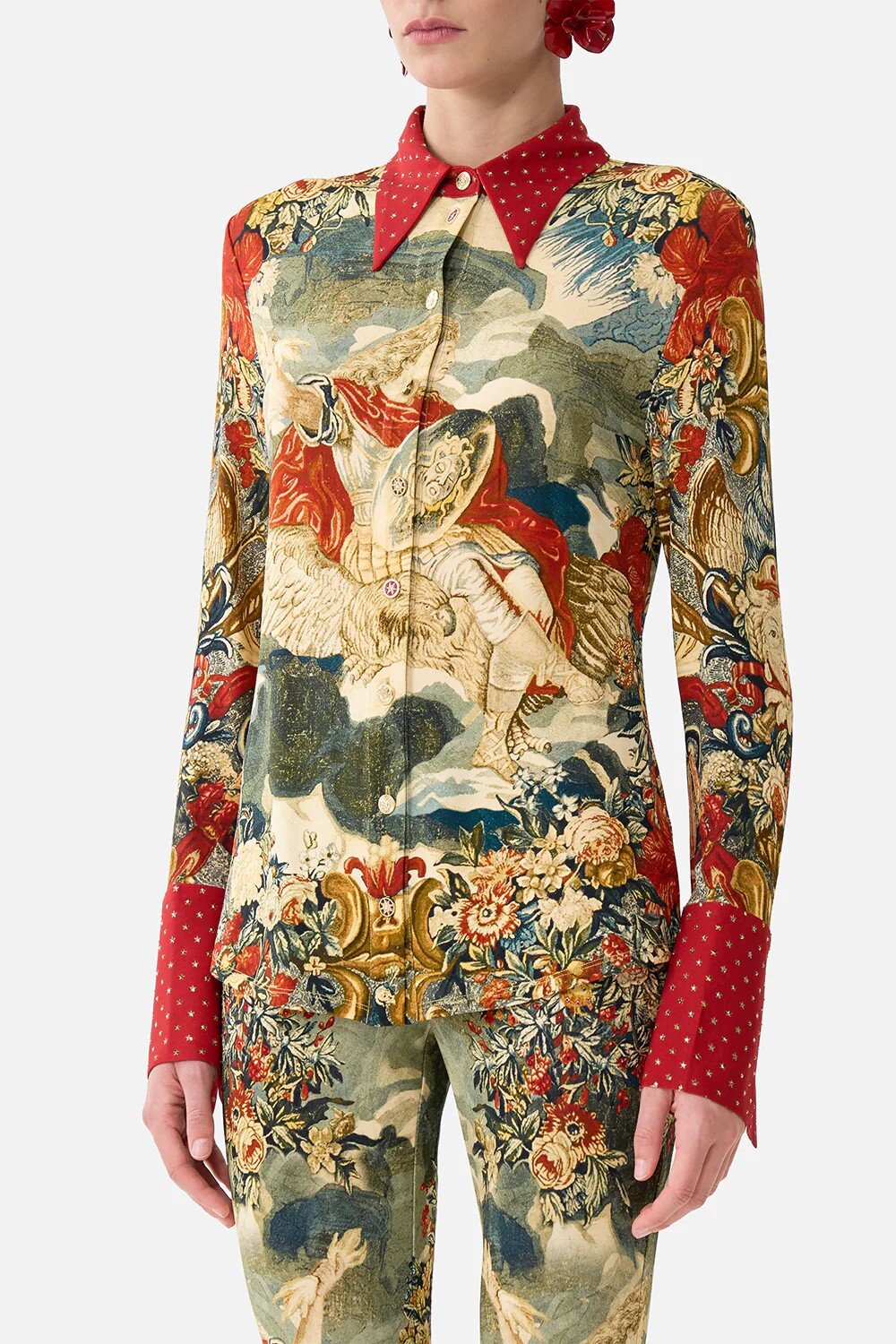 The Meet Me At The Met Fitted Jersey Shirt is a wearable artwork from The Met x CAMILLA collection.It draws inspiration from a 17th-century embroidered French tapestry belonging to a larger set of The Met's textiles representing the seasons and elements.