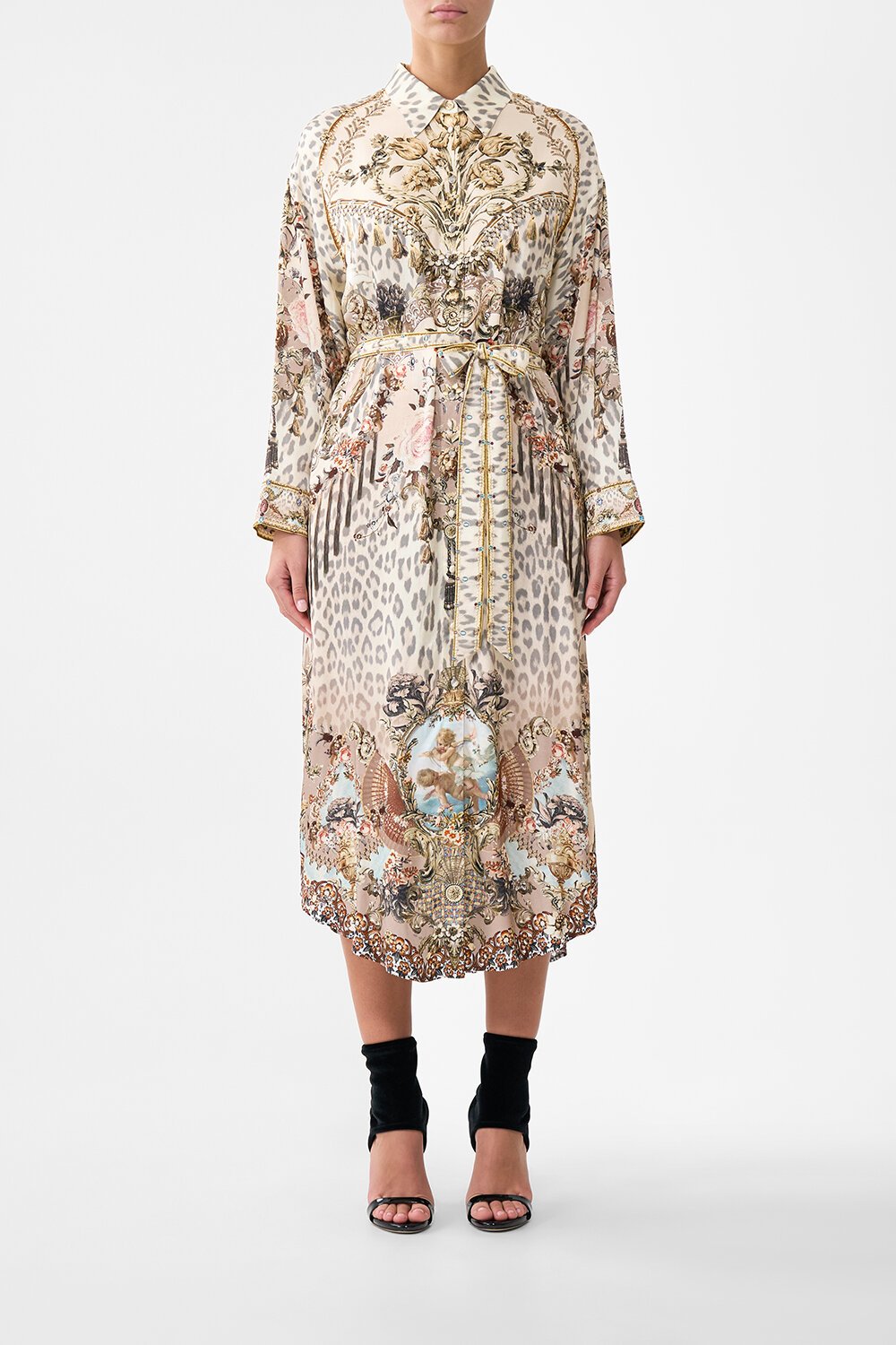 The Aranjuez Animalia Shirt Dress With Back Button Detail is a handcrafted silhouette designed by our in-house artisans. Envisioned in an exclusive limited edition print, this luxury shirt dress is relaxed fitting and falls to a midi length hemline. It's elevated with a removable chain detail and shirt collar for versatility and finished with intricately placed crystal embellishments for luminous detail.