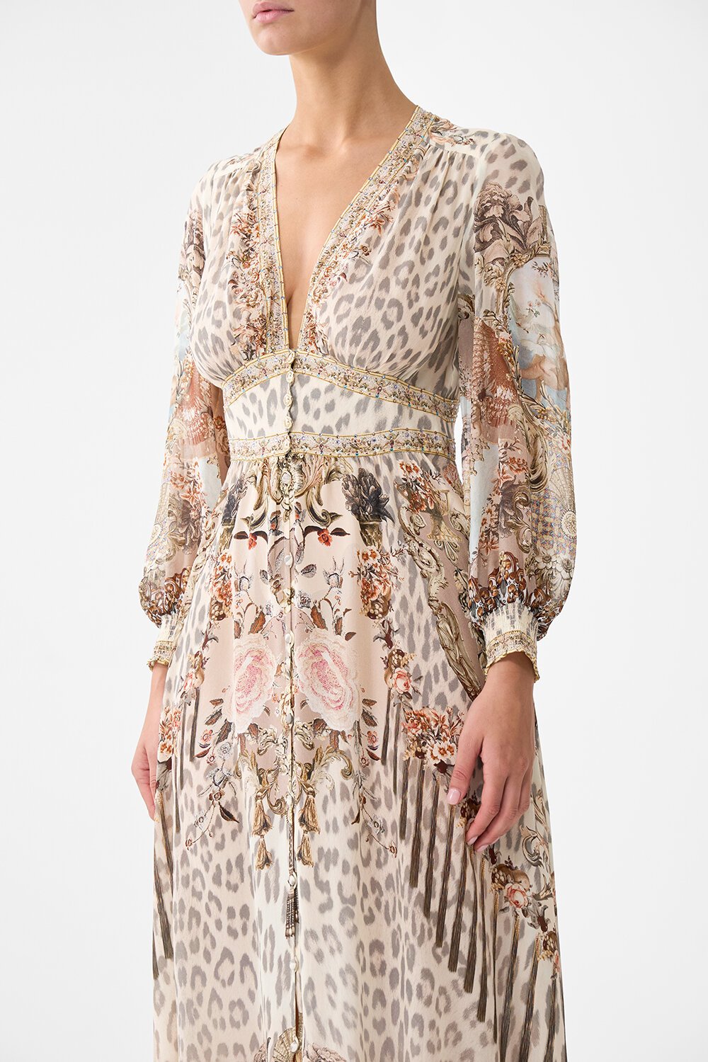 The Aranjuez Animalia Button Dress With Shaped Waistband is a handcrafted silhouette designed by our in-house artisans. Imagined in an exclusive limited edition print, our silk full length dress features a deep v-neckline and shaped waistband that sculpts the feminine form. It's finished with front button closure and intricately applied crystal embellishments.
