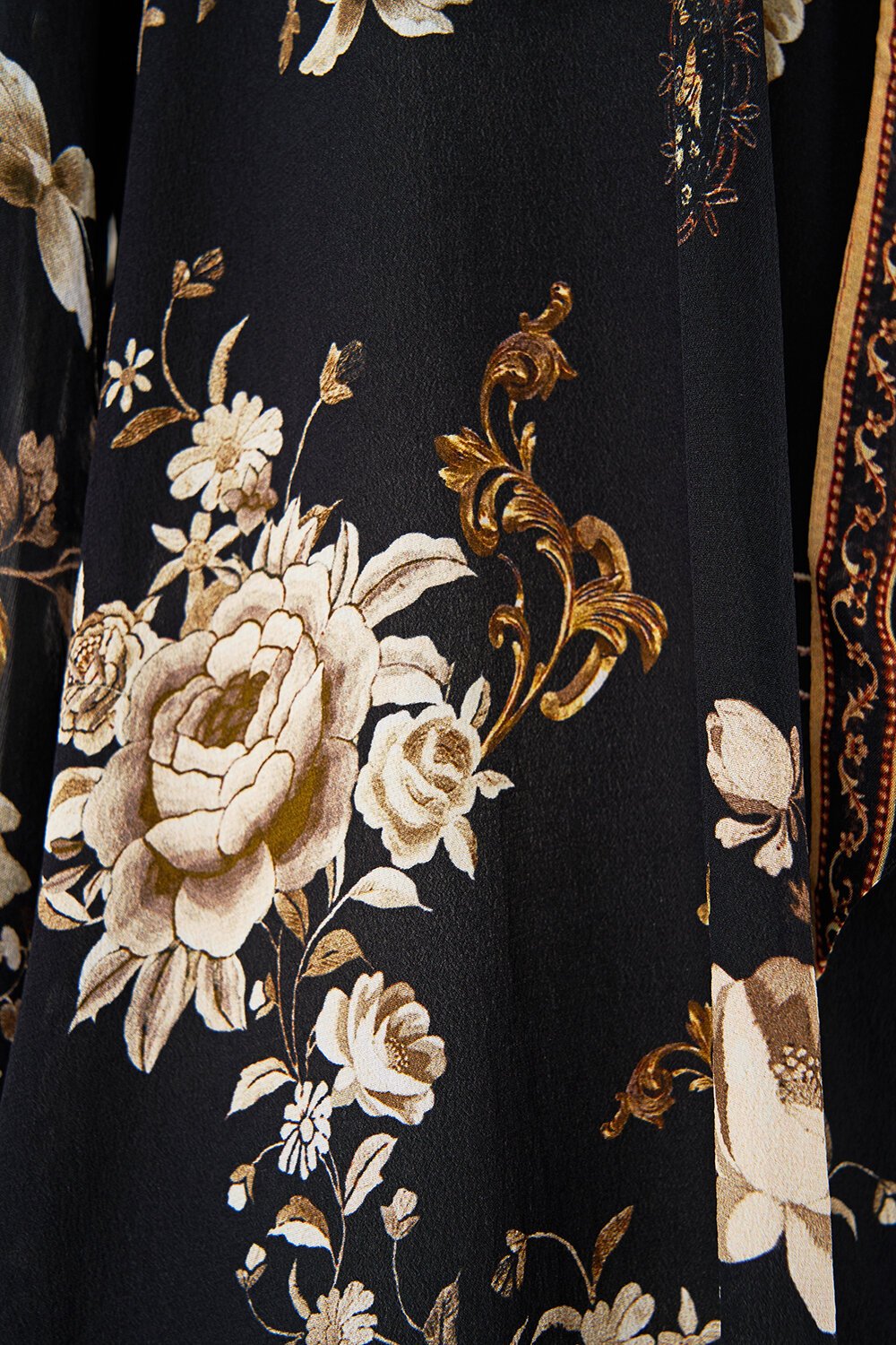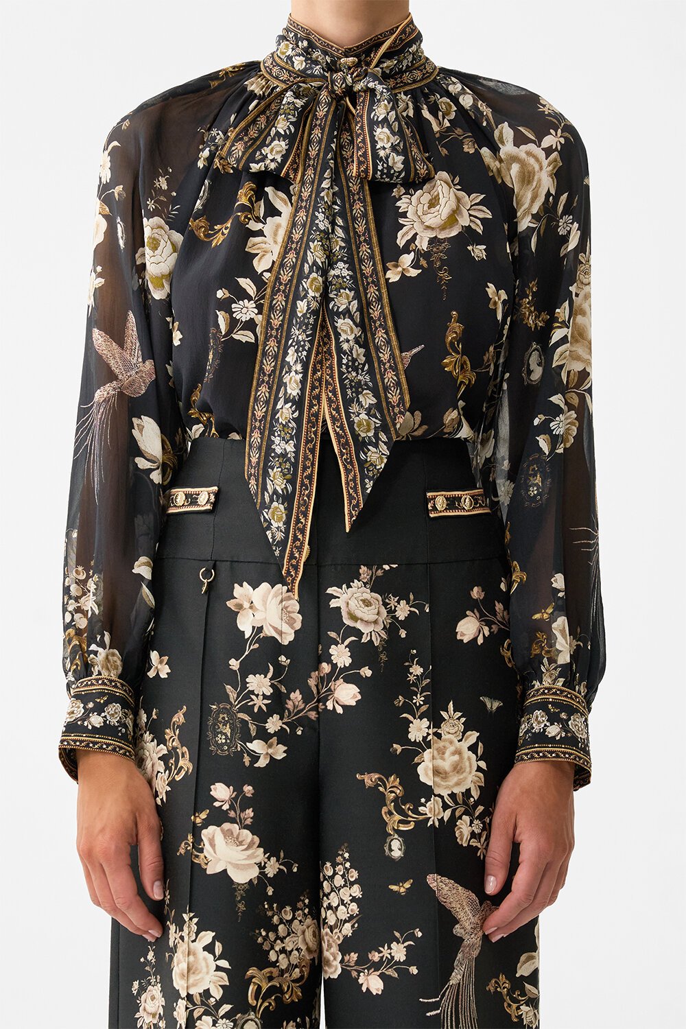 The Flamenco Folklore Detachable Pussy Bow Raglan Blouse is a handcrafted silhouette designed by our in-house artisans. Envisioned in an exclusive limited edition print, our relaxed silk blouse features a structured high collar and detachable pussy bow neck tie for versatile styling options. Raglan sleeves fall into voluminous blouson arms, finished with buttoned cuffs for a tailored edge. A gently flared hem offers ease of movement and can be styled tucked or loose.