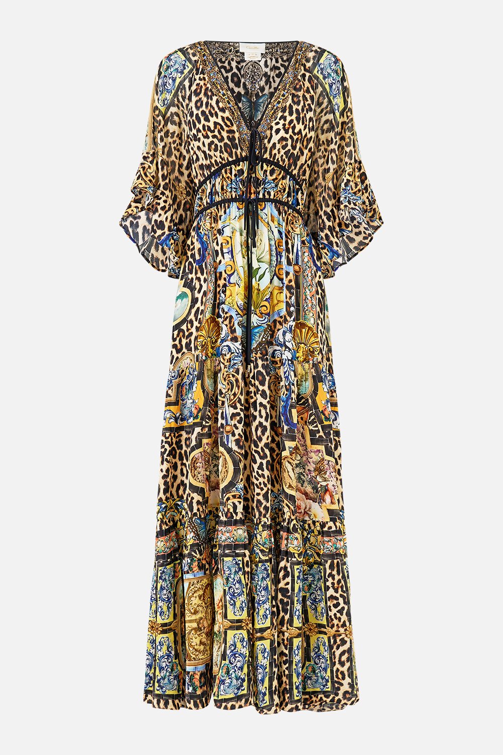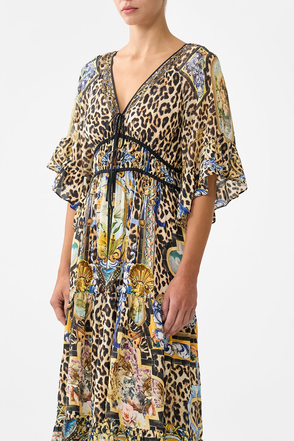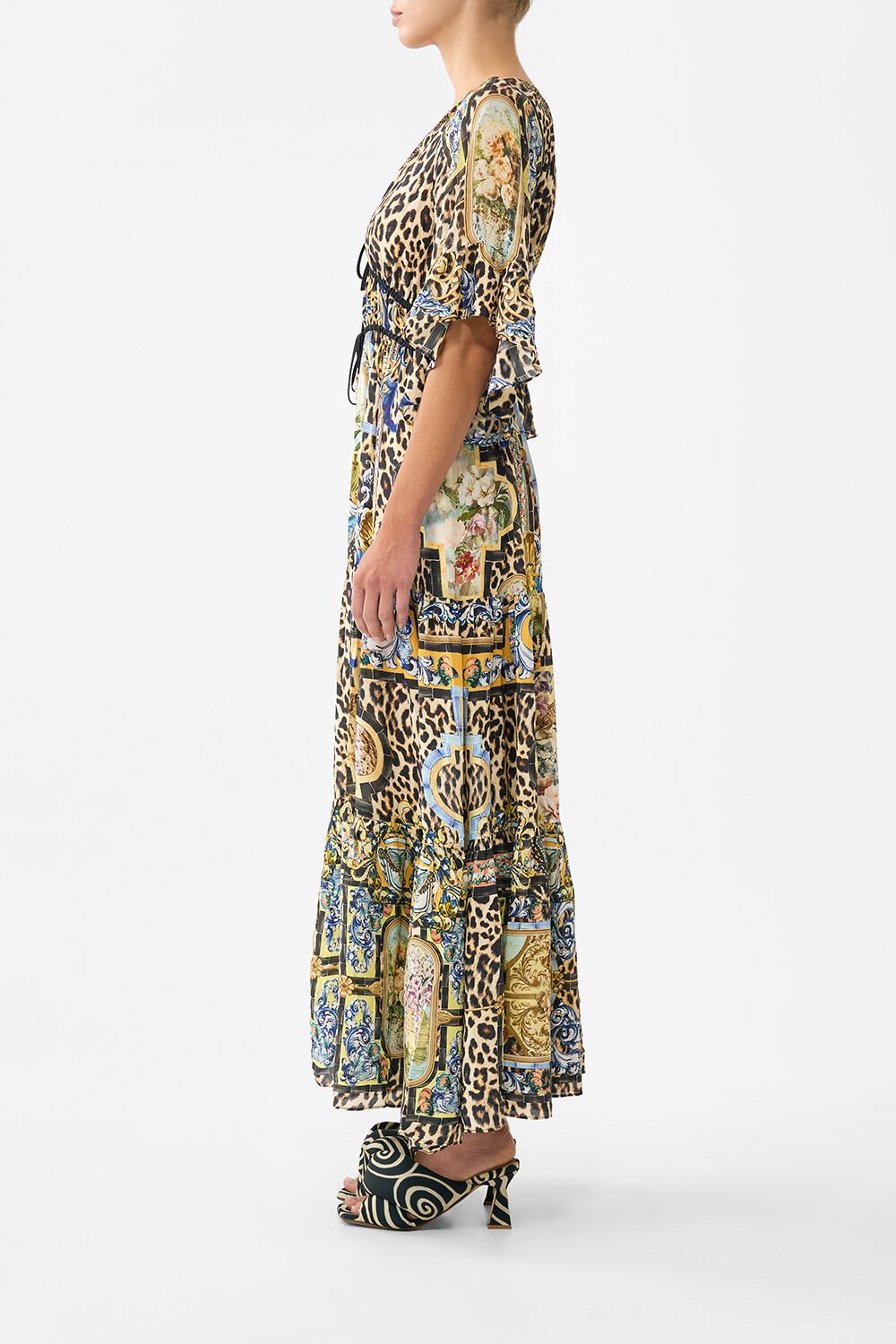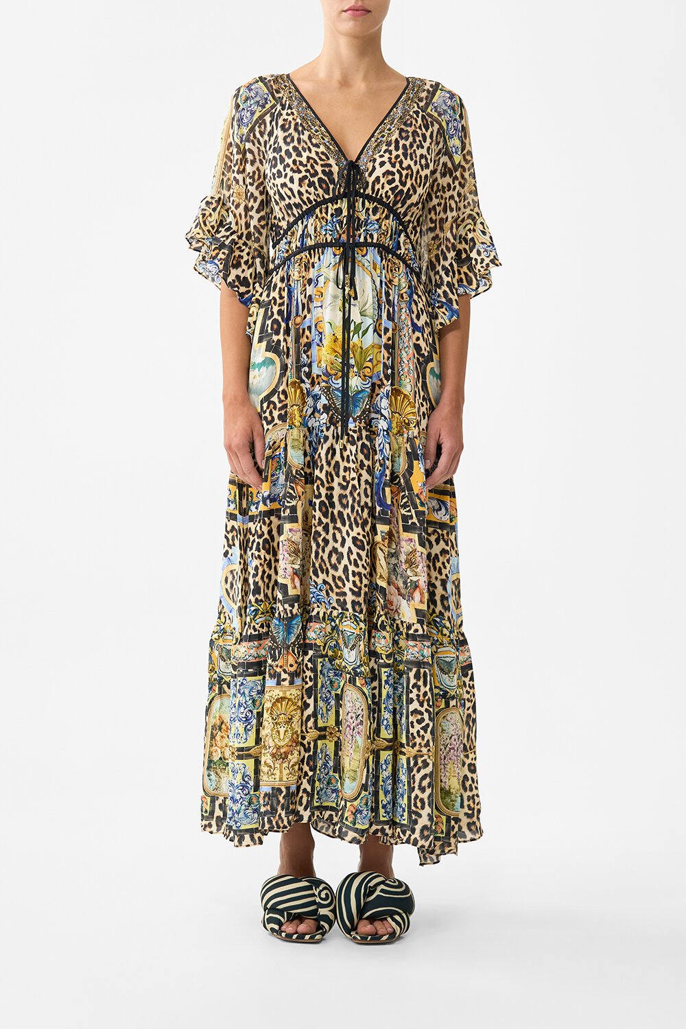 The Sevillian Style Ruffle Sleeve Long Dress is a handcrafted silhouette designed by in-house artisans. Envisioned in an exclusive limited edition print, this silk maxi dress is thoughtfully cut to honour the feminine form. A relaxed fit falls into a tie-front waistband, cinching and shaping as an elasticated back ensures your most tailored fit. This modern heirloom is finished with the romance of a ruffle and intricately applied crystal embellishments.