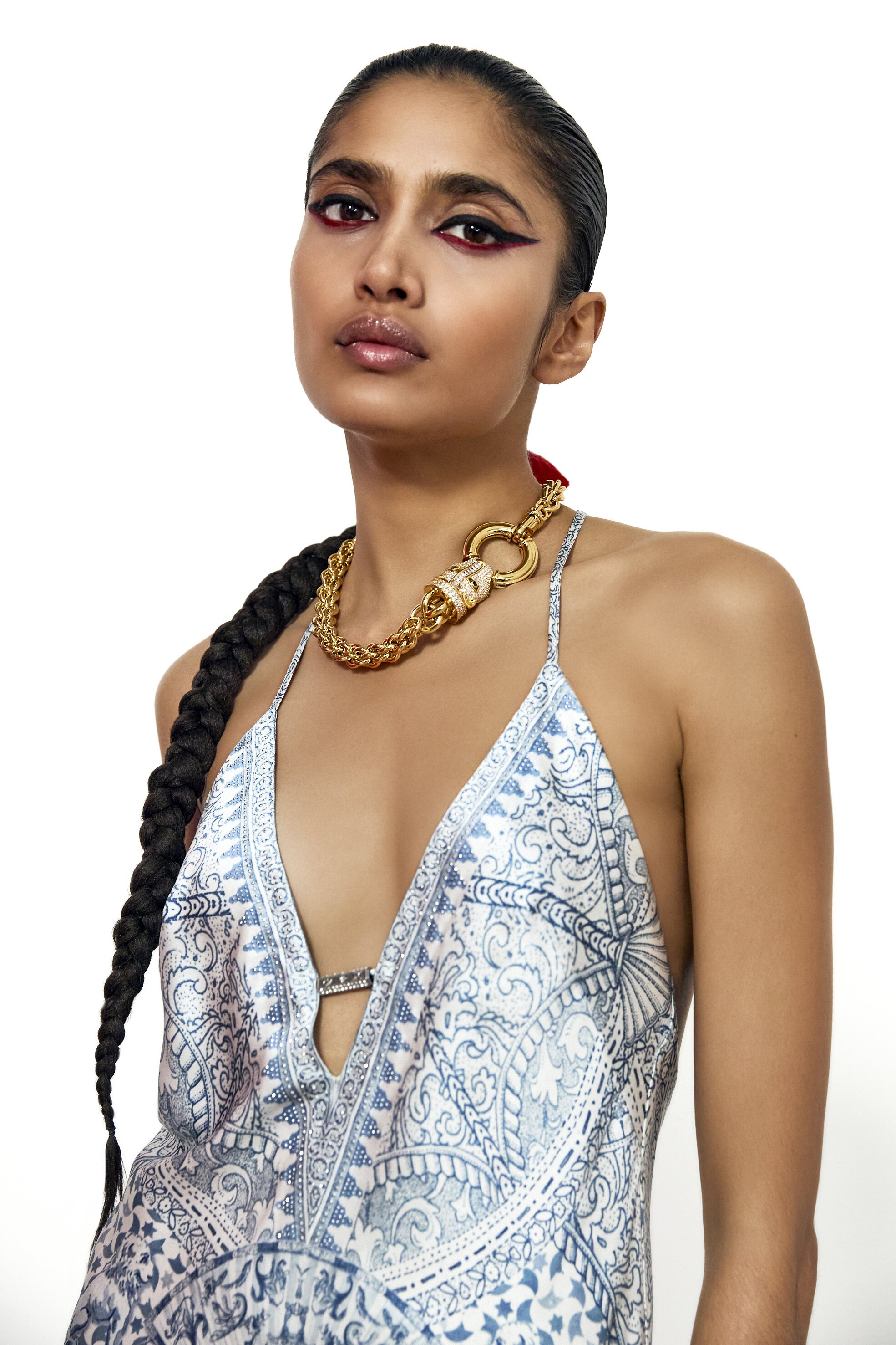 The Savage Beauty Chain Necklace is a handcrafted accessory designed by our in-house artisans. Created as a statement chain silhouette, this necklace is crafted with a solid brass base and finished with 18K gold plating for a luminous, high-impact finish. Intricately detailed with cubic zirconia crystal accents, the bold chain construction is balanced by refined craftsmanship and considered proportion.