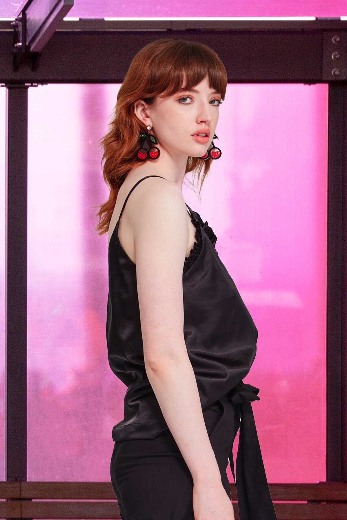Designed in a 'Sheenic View' satin polyester. Simplistic elegance with refined subtle detailing. Featuring thin straps, delicately frilled V-neck and a light sheen finish. A luscious fundamental piece that you will wear on repeat.