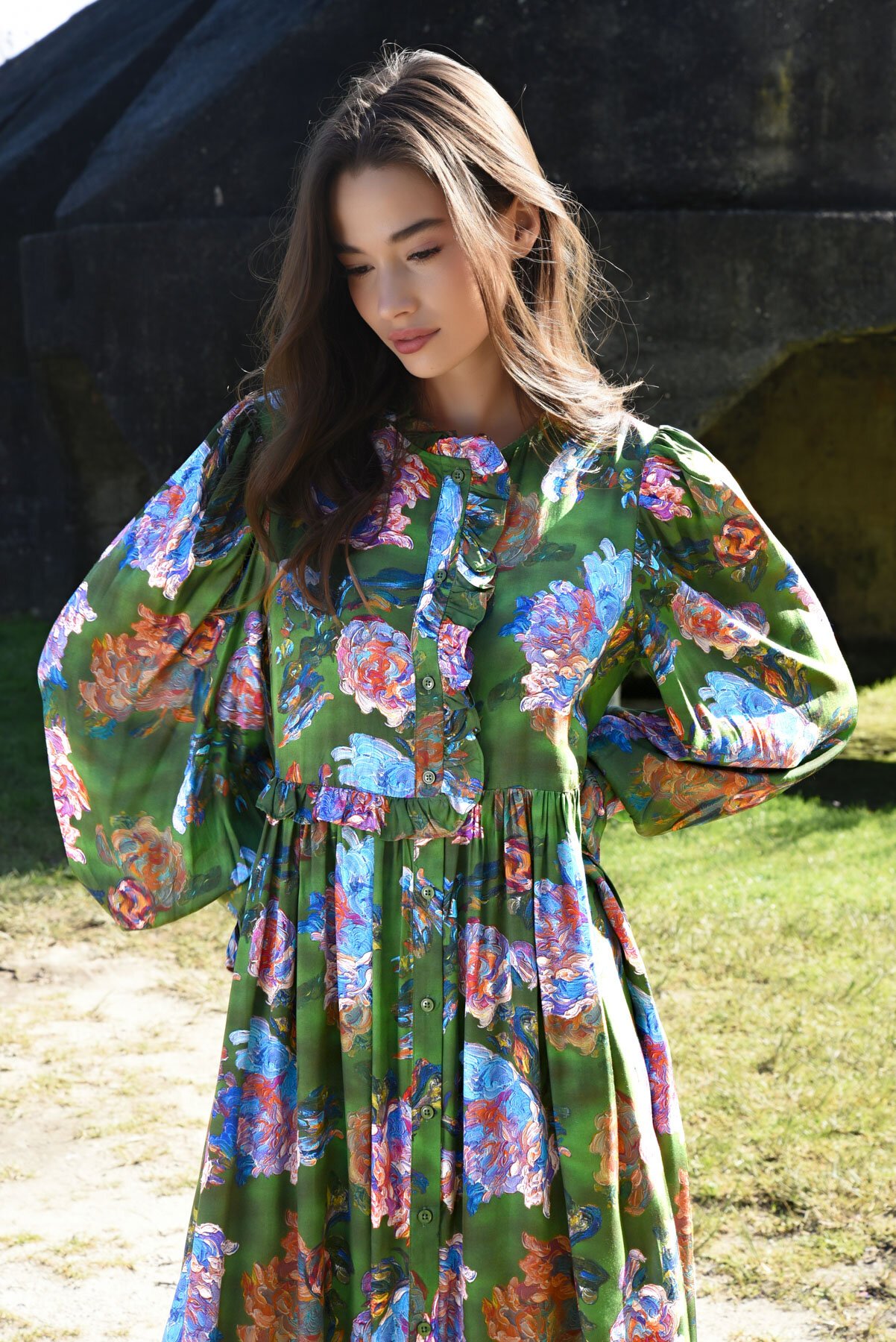 Bursting with colour and personality, the ‘Floral Flair’ dress, brings an artistic flair to every movement. Crafted using the vibrant ‘Brush Strokes’ printed fabrication to create a dreamy, painted on effect, this dress features a gathered waist for an effortlessly flattering shape, frill placket and frill cuffs that add a soft playful touch, with the button through front keeping it versatile. Feminine and full of charm, this is the dress that turns the simplest outings into a masterpiece.