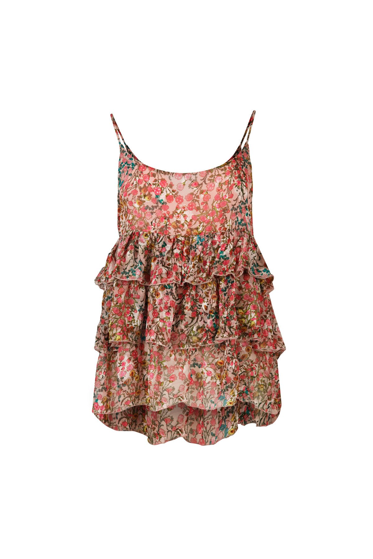 Designed in the 'Whimsical Garden' jacquard chiffon fabric. The lively pink top features frills throughout, thin straps, round neckline and a high low hem. Pair with the 'Just Relax' pants in sage for comfortable yet fashionable everyday summer look.