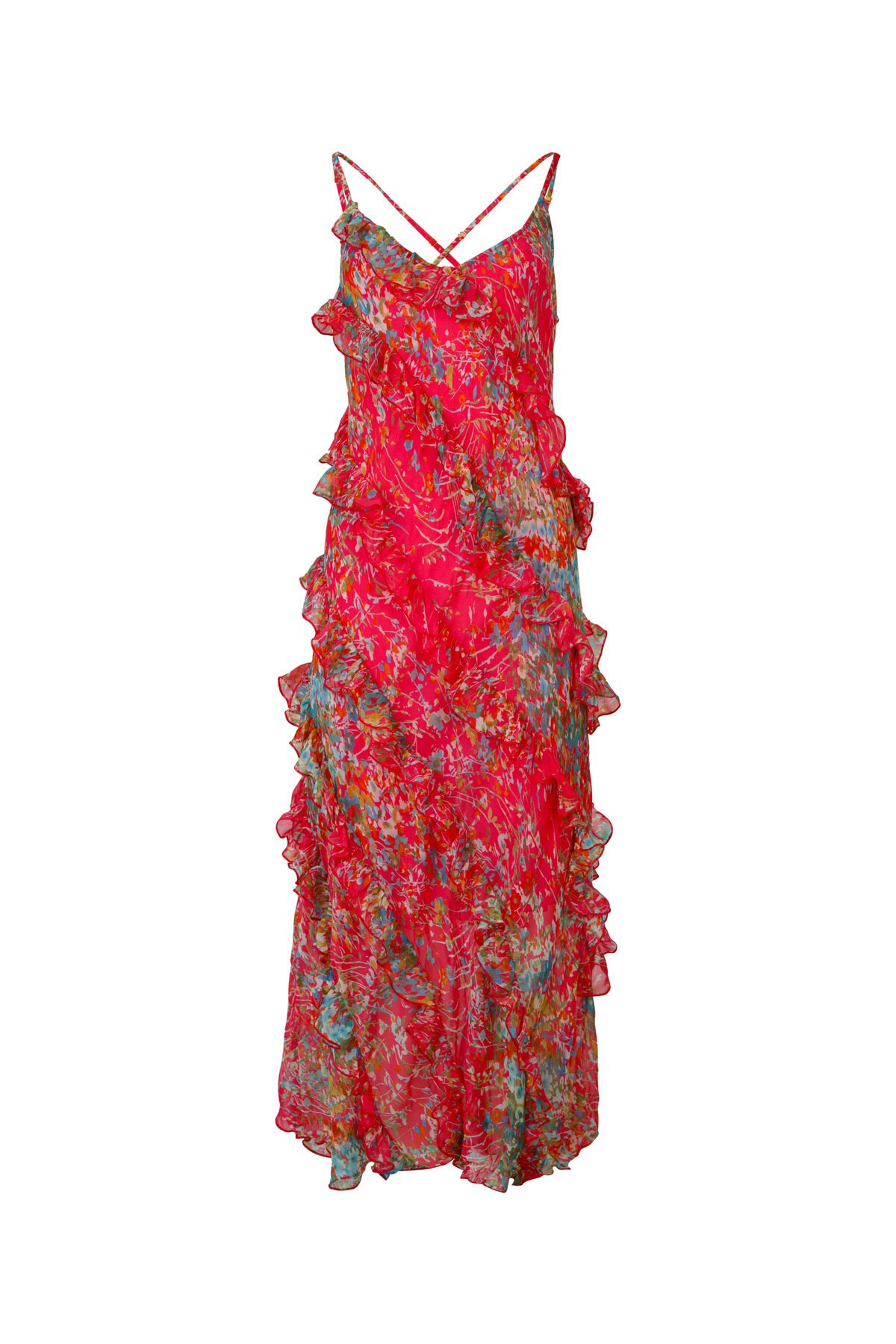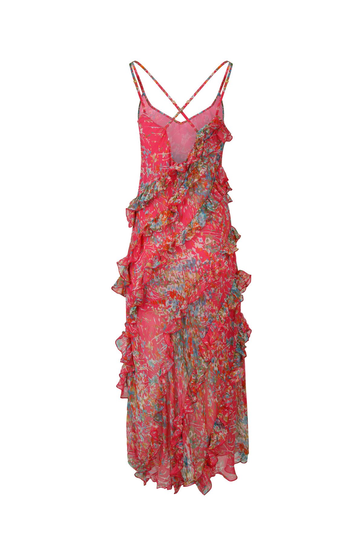 Designed in the 'Pink-A-Boo' chiffon print fabric, is your next vibrant pink summer dress. Featuring diagonal frills throughout, cross-over back straps and round neck. This maxi dress can be styled with sneakers for a casual summer day, or with heels for an evening event.