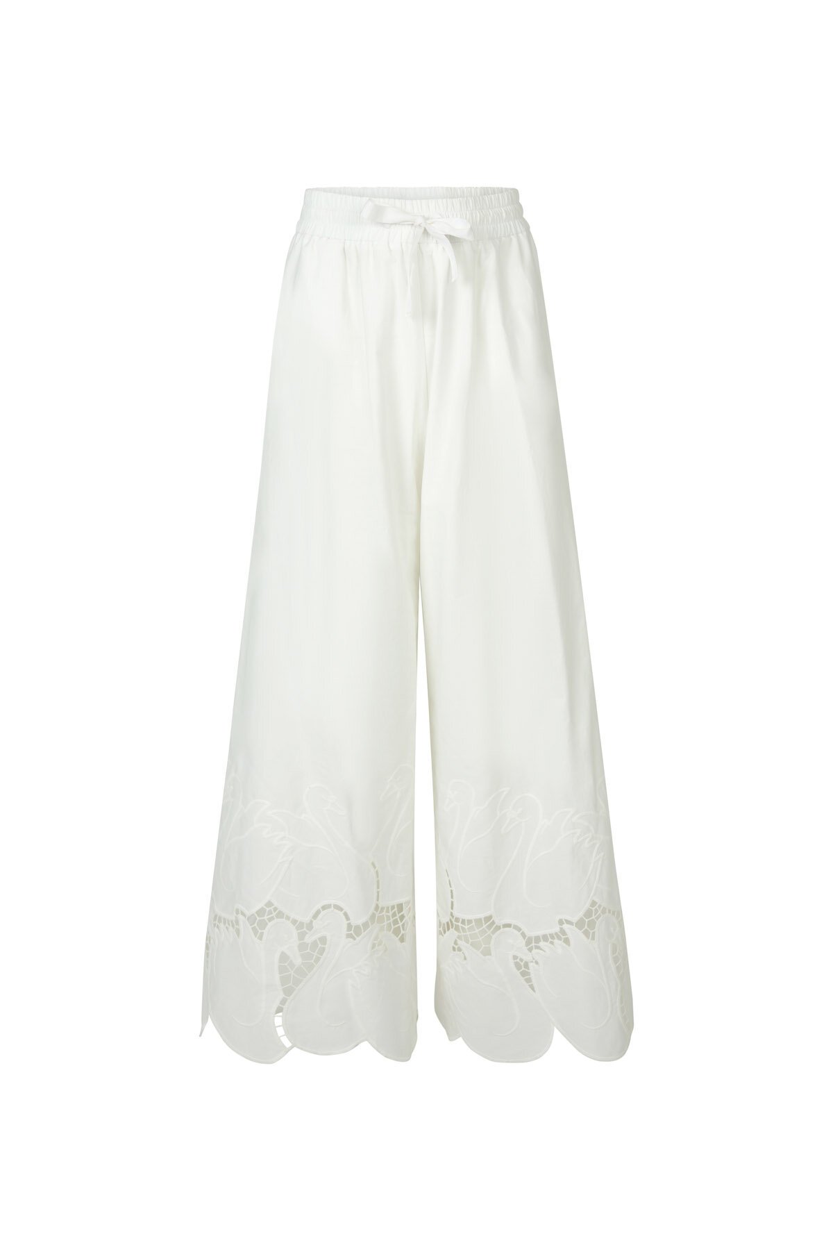 Designed in the 'Swan Song' embroidered cotton fabric. This loveable pant is complete with an elasticated waistband, grosgrain drawcord, side pockets, and scallop hemline. Perfect for when you are heading out into the summer days ahead.