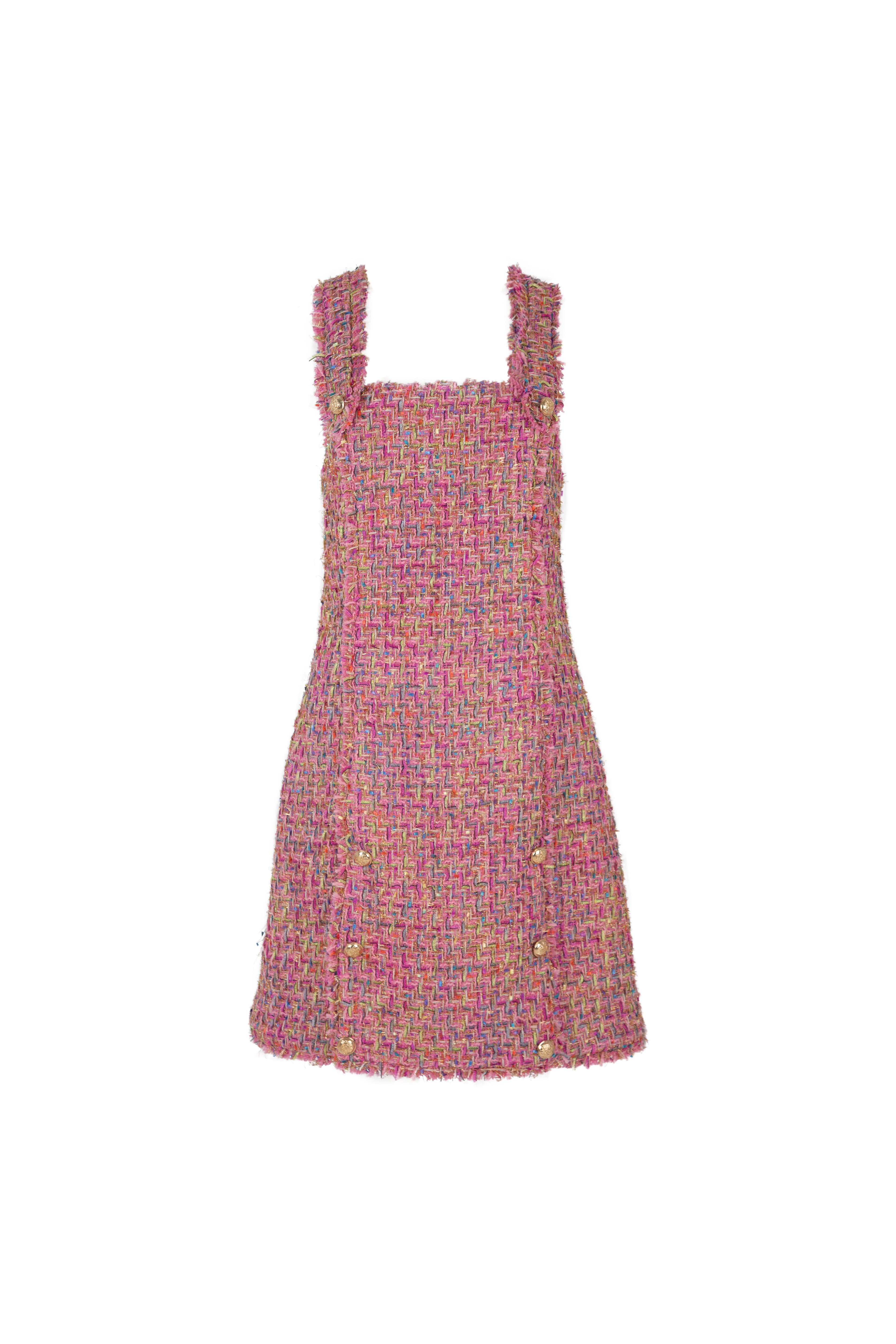 Add a little tweed to your look in the ‘On The Button’ dress. A pink tweed number featuring wide straps, button detailing and ending at the mid-thigh. Perfect for layering this dress will see you through season to season.