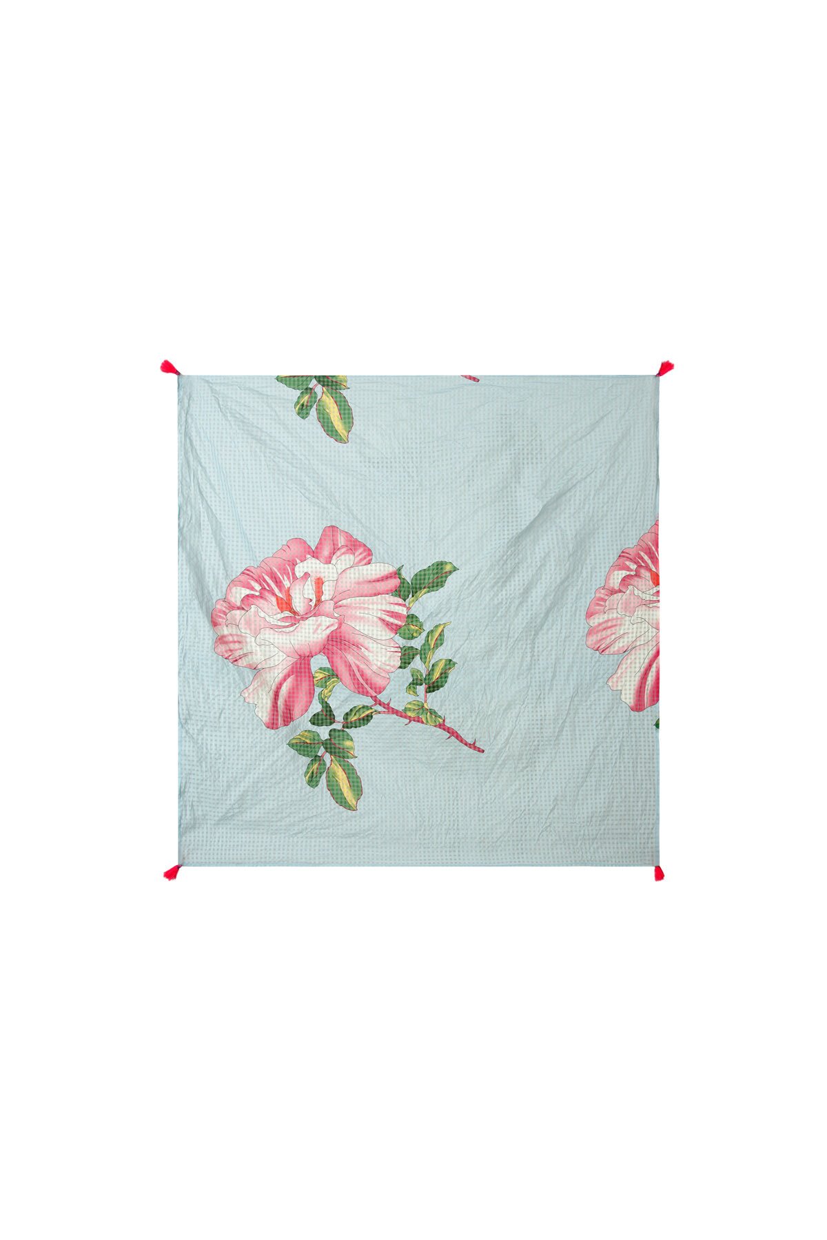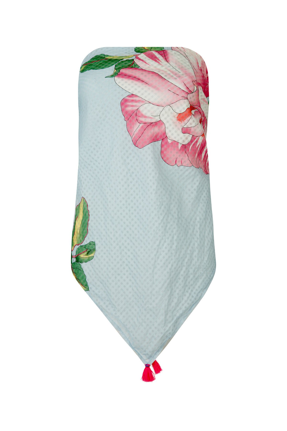 Designed in the 'Peony Dream' polyester print fabric. This scarf top features a pastel baby blue and pink florals, ties at the back, strapless with pink tassels on edges. Pair with the 'Tiers Go By' skirt also in peony dream fabric for an adorable matching summer set.