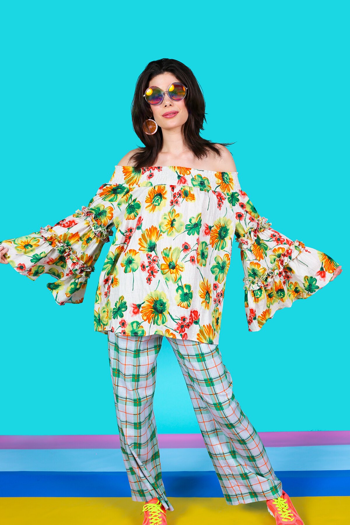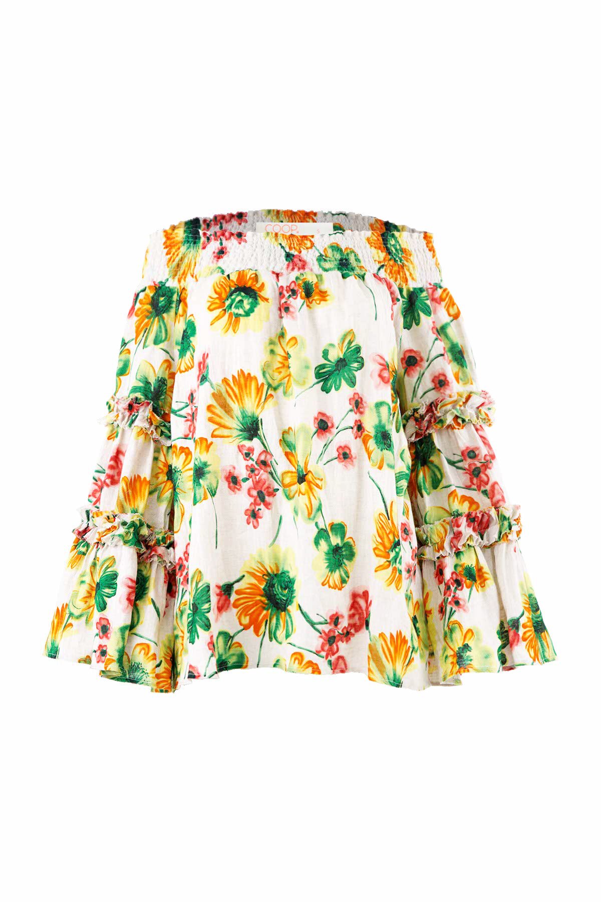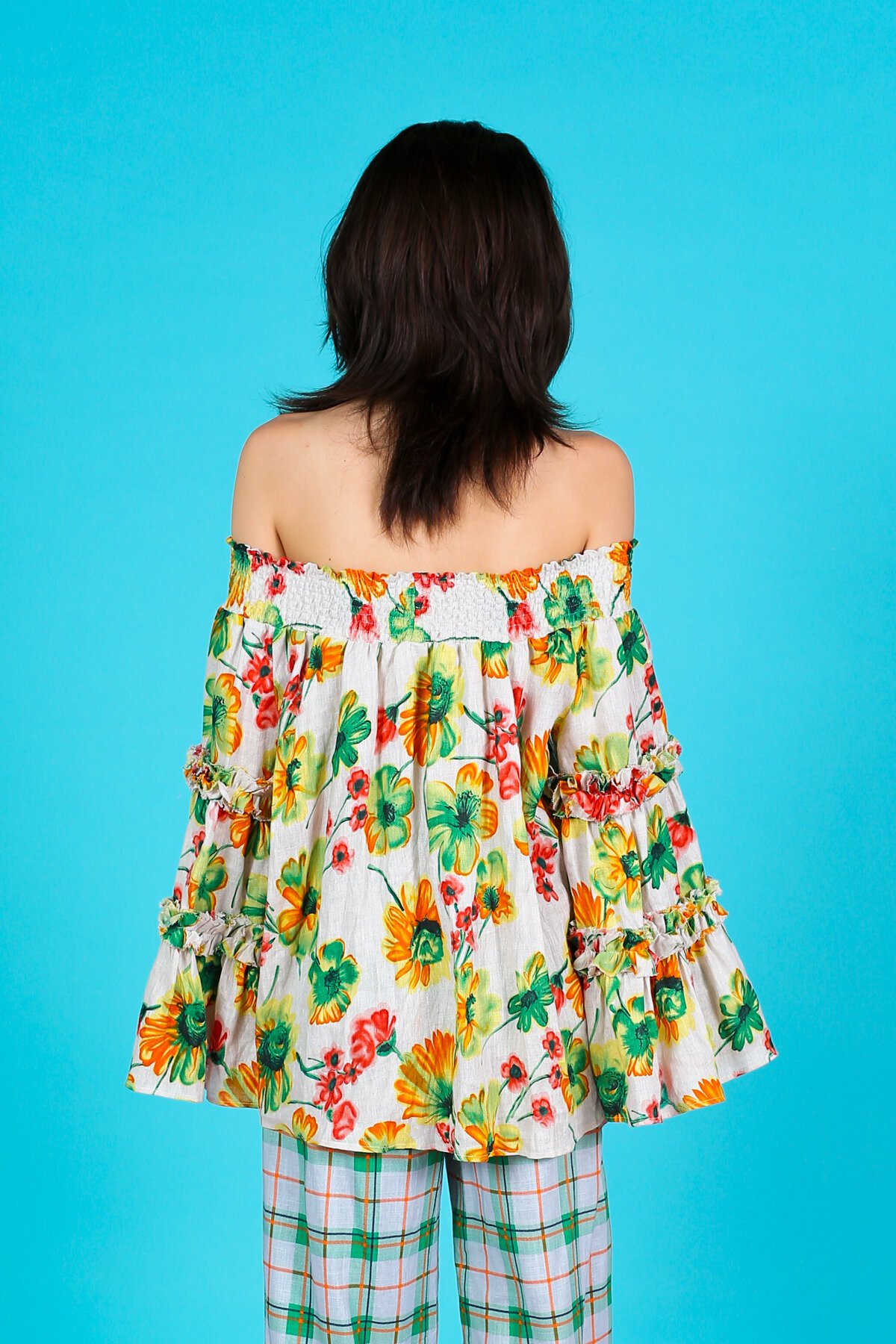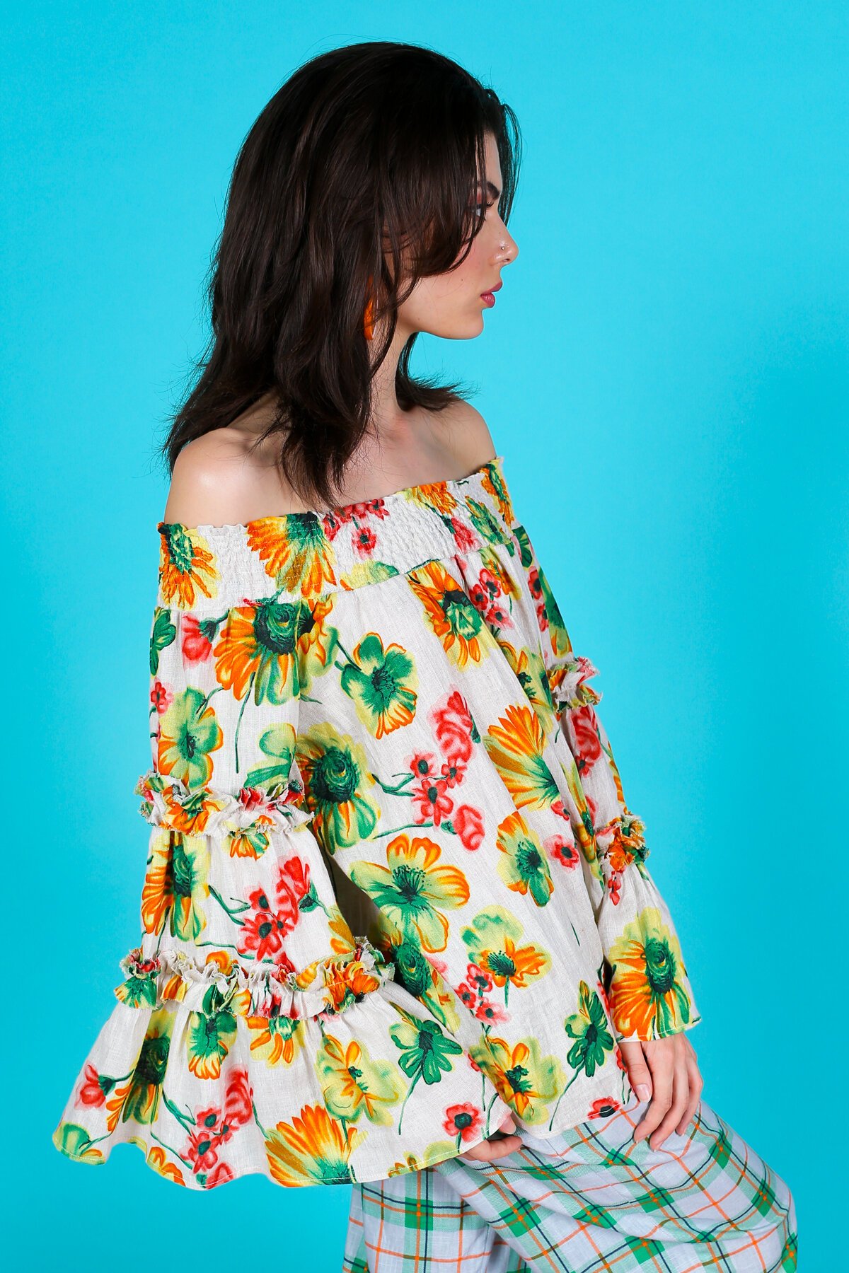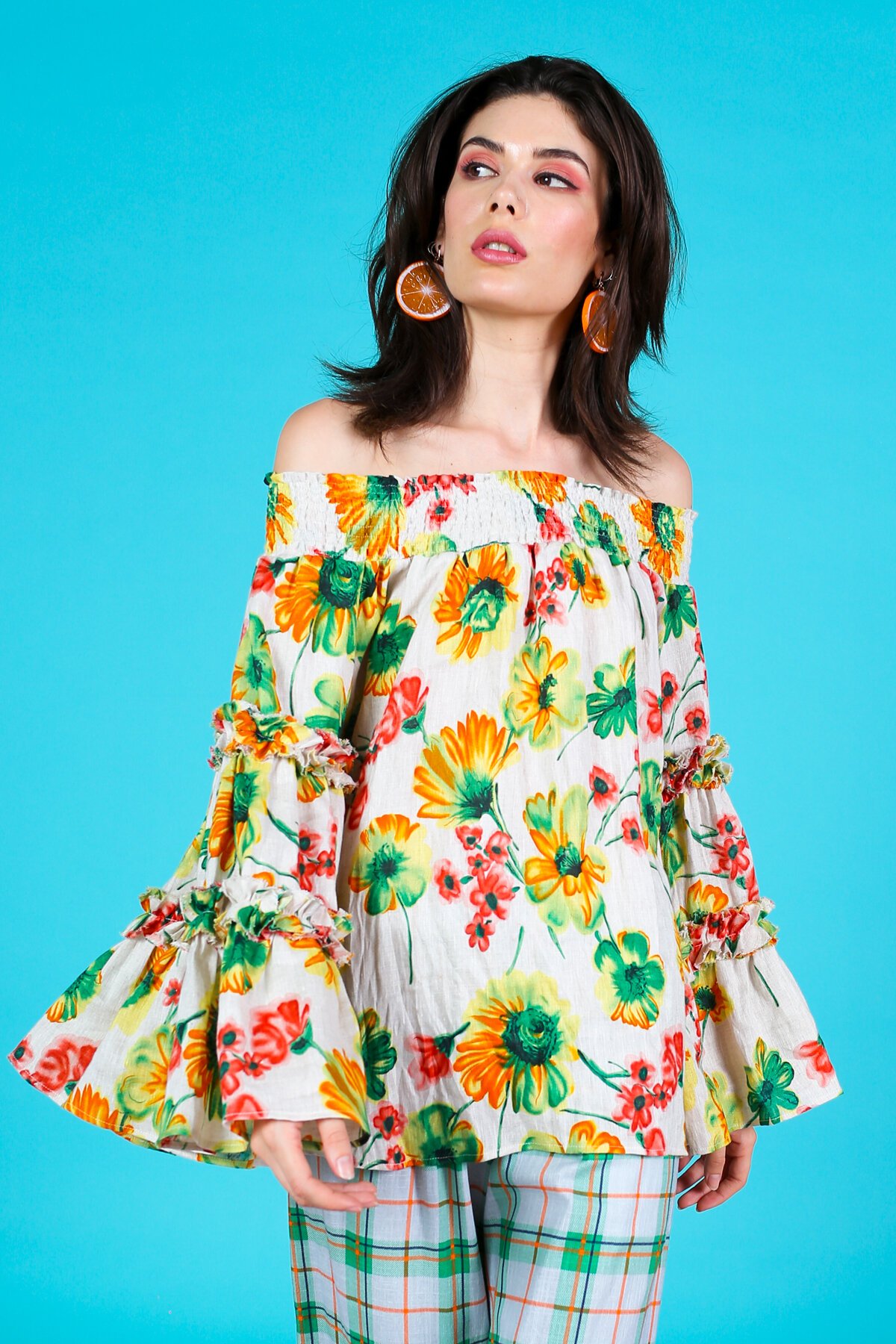 The ‘Solar Flare’ top from Coop by Trelise Cooper. Designed in “LIVING LIN-EN” floral printed linen. An off-shoulder flared sleeve, floaty spring style.