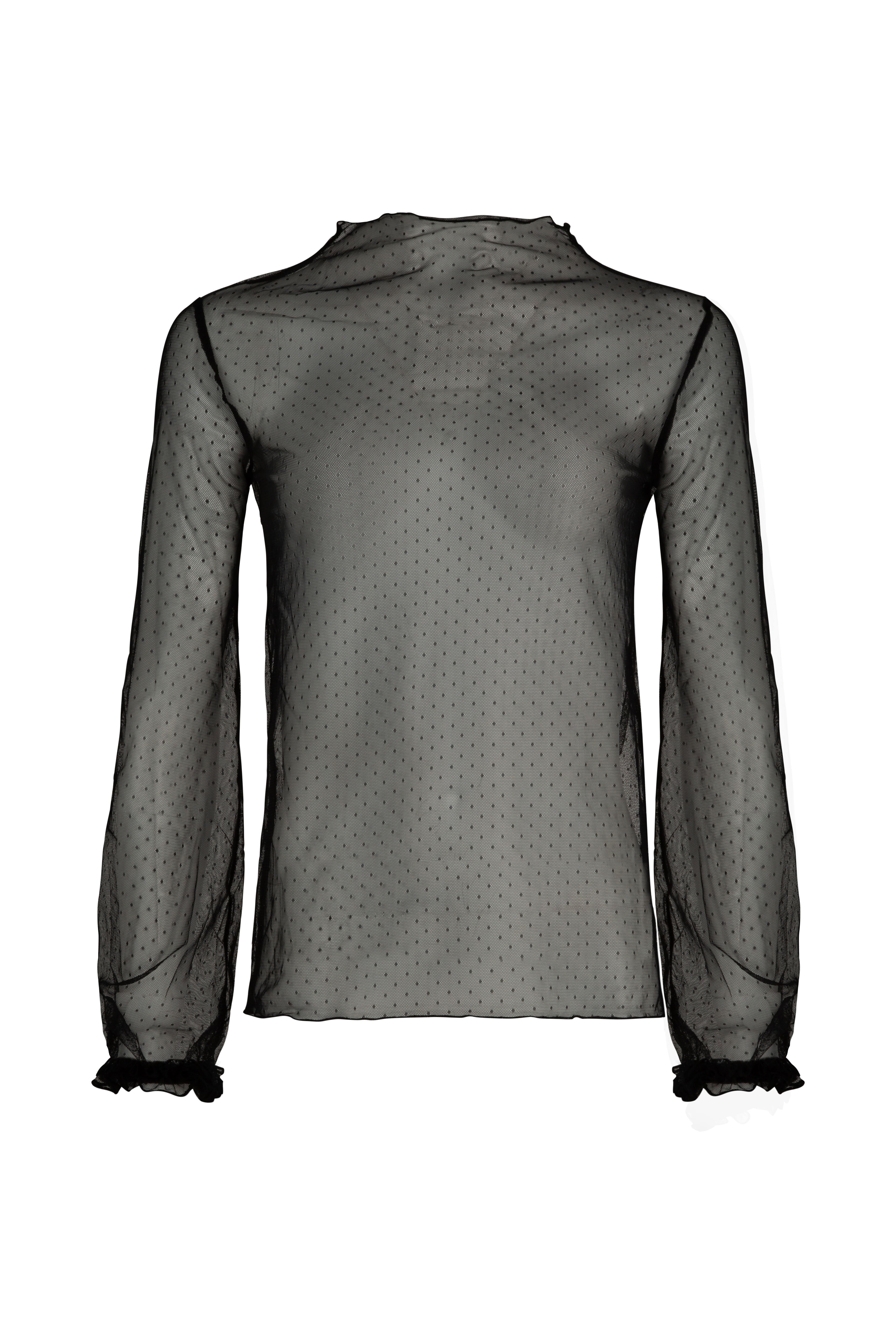 Experiment with layering during the colder months with the 'Some Like it Dot' top in our 'Dot Topic' mesh. Crafted from sheer mesh, adorned with polka dots and ruffle cuffs, this delicate piece adds sophistication and glam, and is a must-have for easy styling. Pair with our 'Pinafore Seasons' dress for a feminine yet edgy look. • Mesh fabrication • Lettuce neckline and hem • Polka dot print Cool hand wash or gentle machine wash. Wash inside out. Do not bleach, wring, rub, soak or tumble dry. Light spin. Line dry immediately in shade. Cool iron on reverse. Dry cleanable. 100% Polyester Lining 100% Polyester