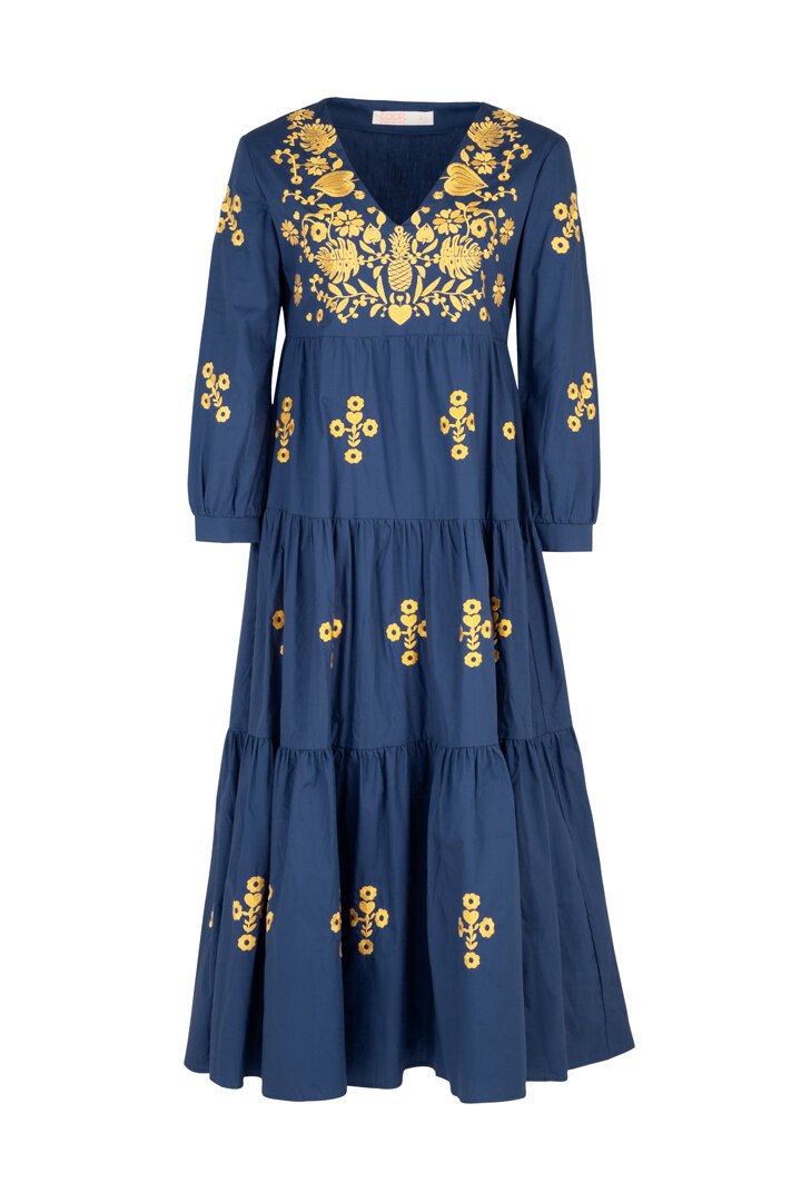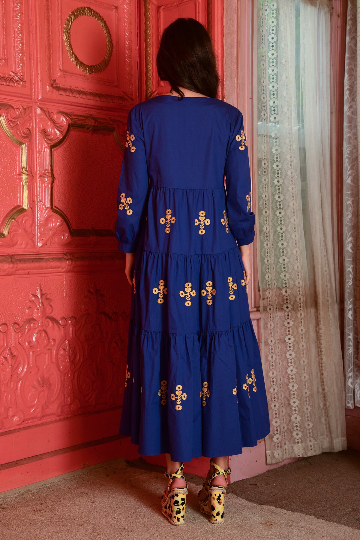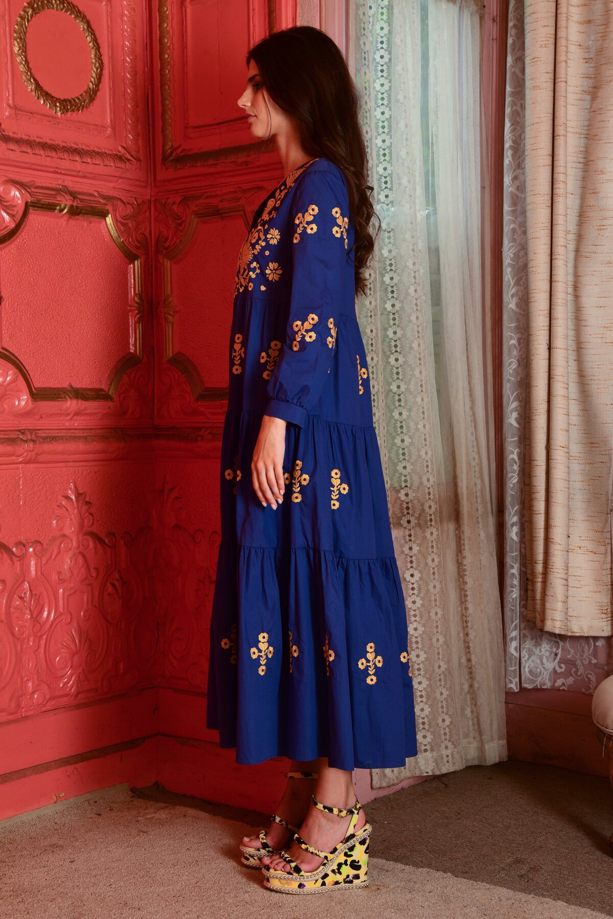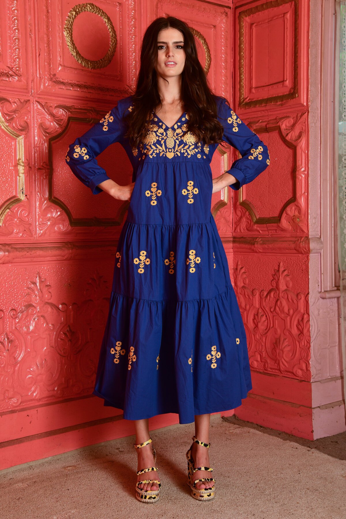 Bold and bright is what this season is all about. Transport to a vacation with the new ‘Stitch Hiker’ dress created in our ‘Stitch & Famous’ cotton poplin fabrication. This contrast embroidery detailed dress features a V neckline, elasticated cuff sleeves, and soft tiers floating down to a maxi A-line shape, making it super flattering to wear.