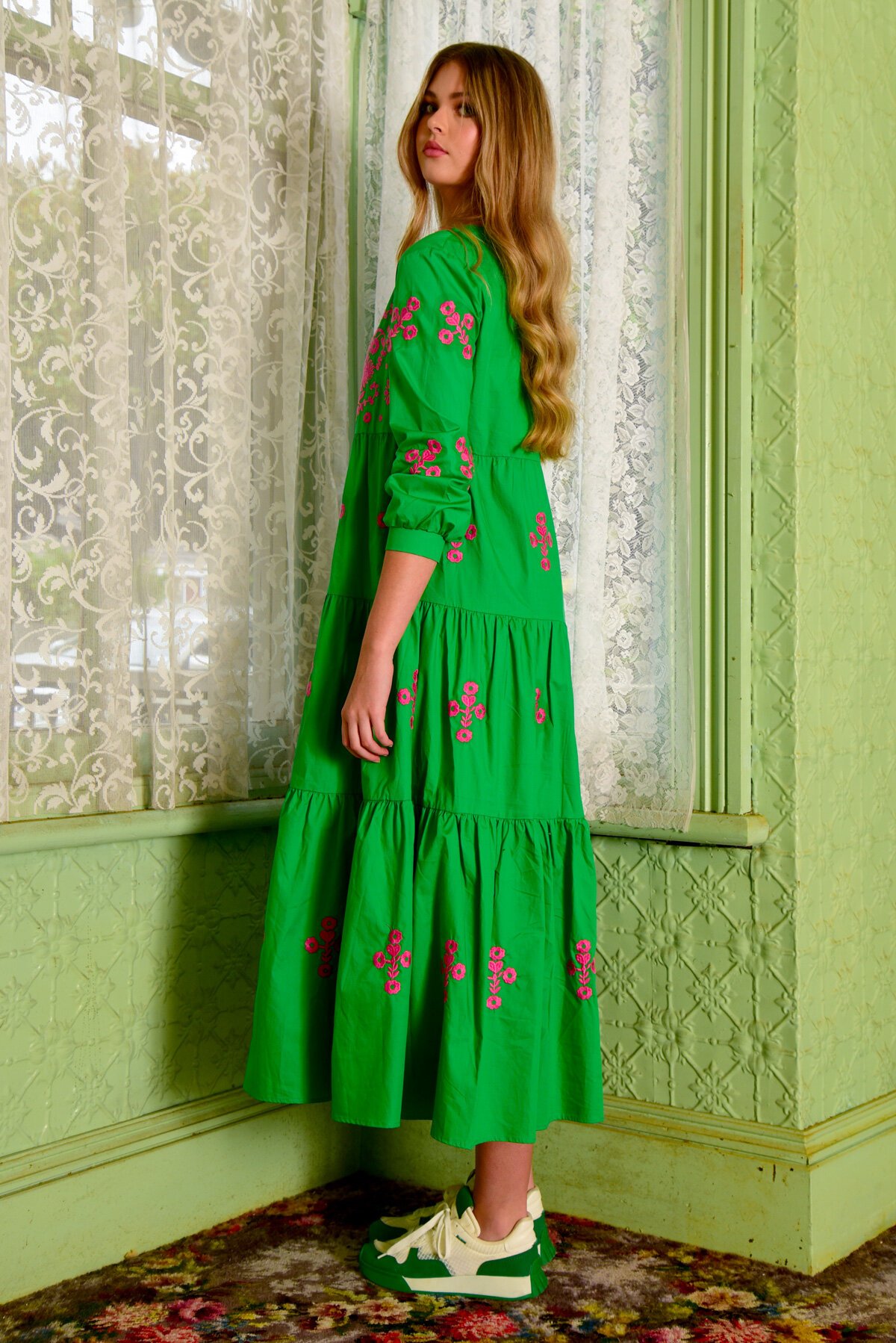 Bold and bright is what this season is all about. Transport to a vacation with the new ‘Stitch Hiker’ dress created in our ‘Stitch & Famous’ cotton poplin fabrication. This contrast embroidery detailed dress features a V neckline, elasticated cuff sleeves, and soft tiers floating down to a maxi A-line shape, making it super flattering to wear.