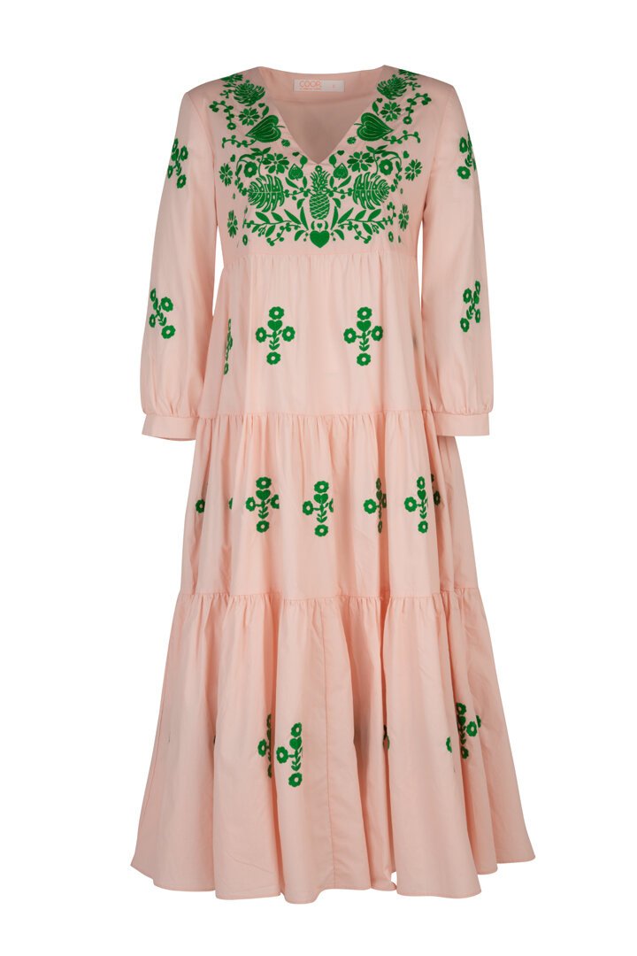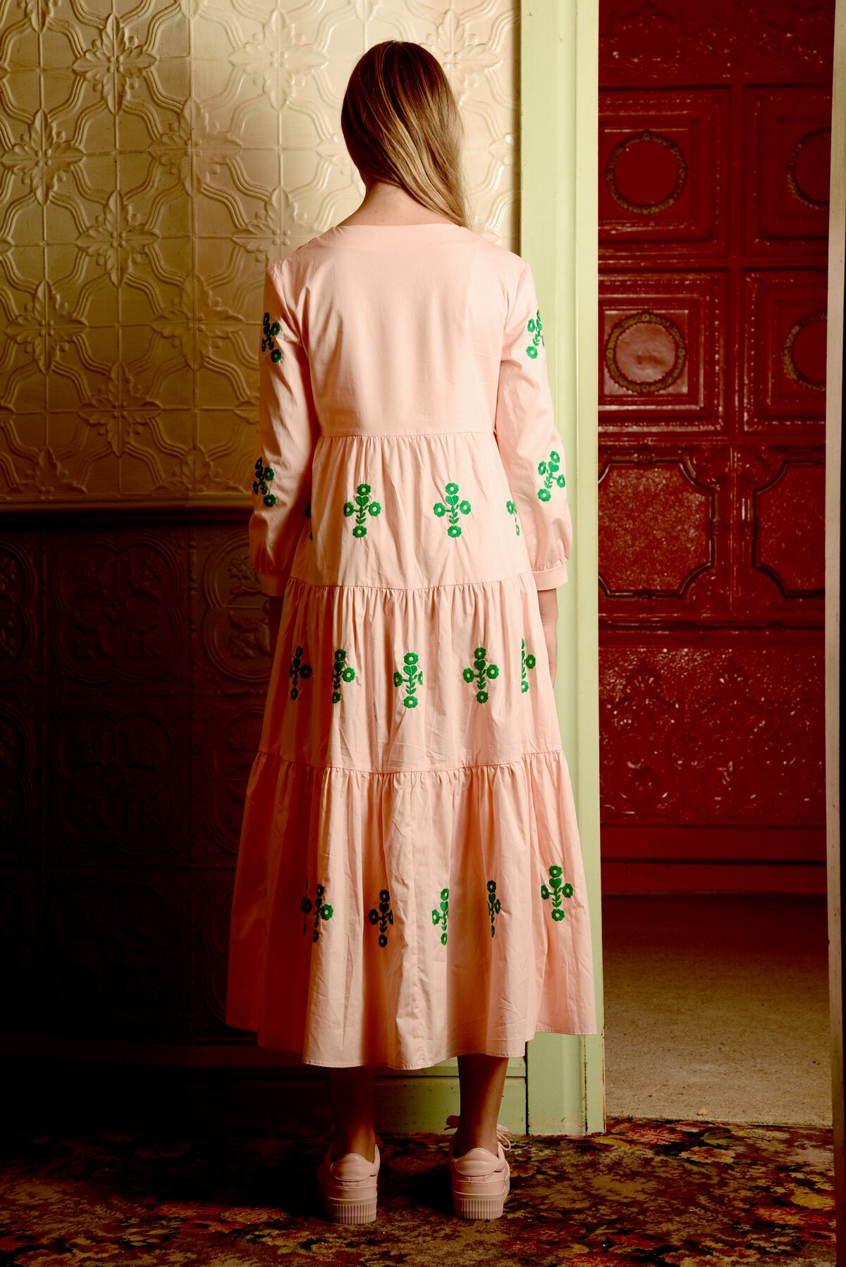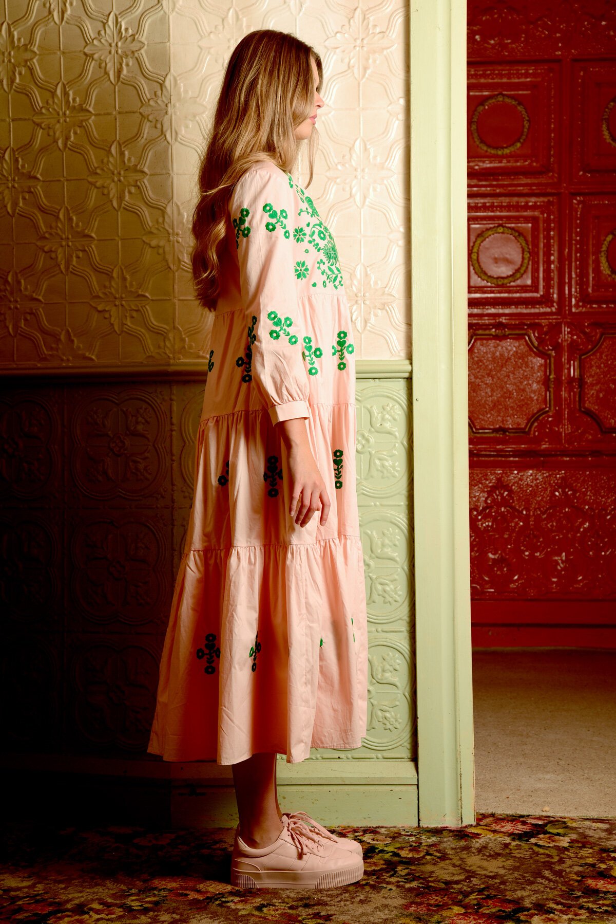 Bold and bright is what this season is all about. Transport to a vacation with the new ‘Stitch Hiker’ dress created in our ‘Stitch & Famous’ cotton poplin fabrication. This contrast embroidery detailed dress features a V neckline, elasticated cuff sleeves, and soft tiers floating down to a maxi A-line shape, making it super flattering to wear.