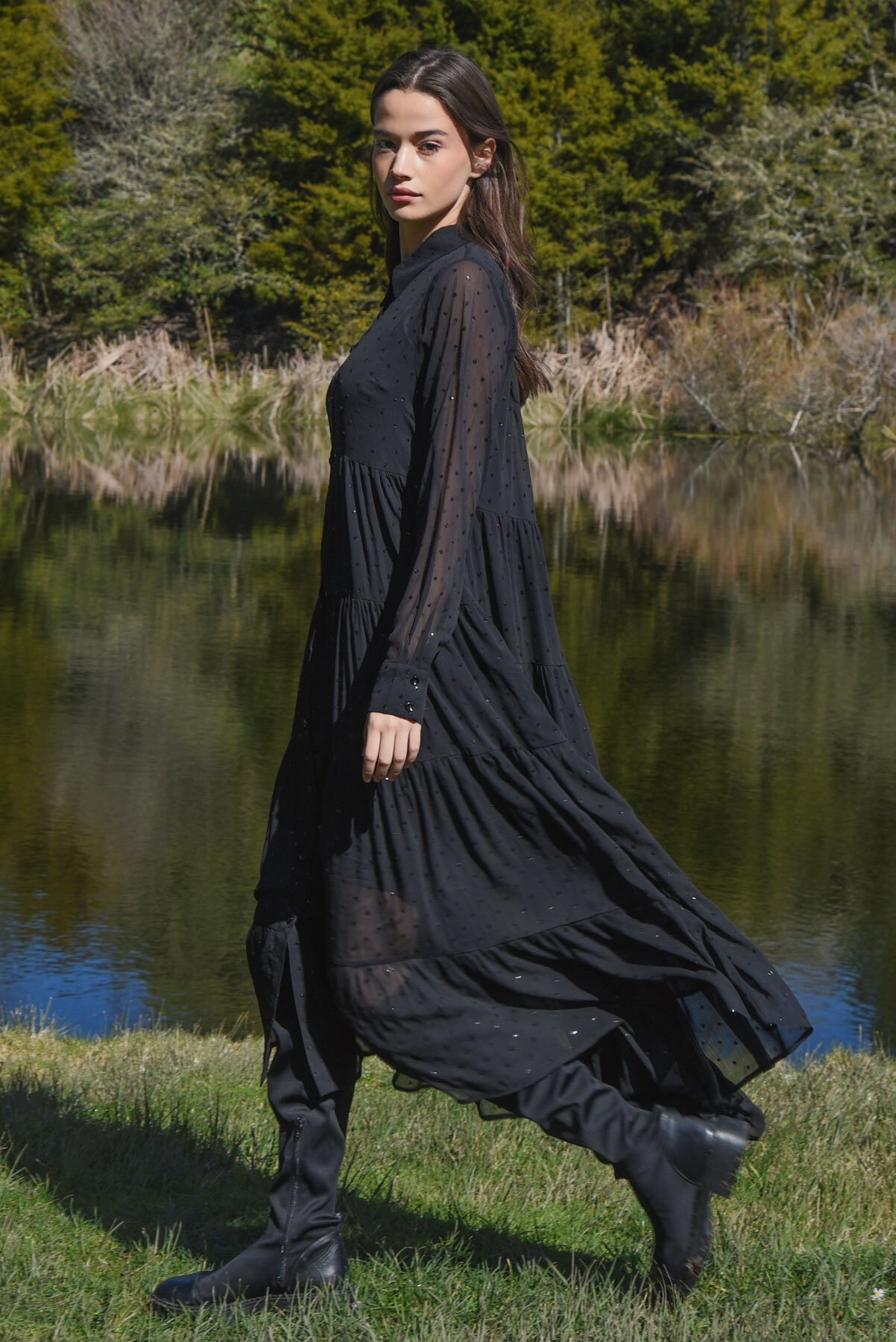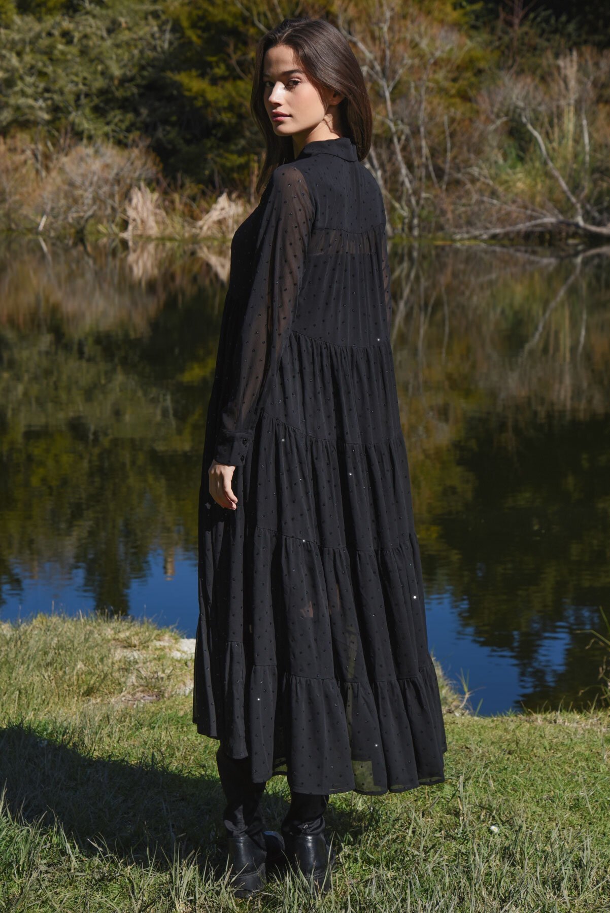 Crafted from the beautifully textured crinkle chiffon fabrication of the ‘Glitterati,’ the ‘Sun & the Swoon’ dress is the ultimate showstopper. Falling gracefully from the bust into soft gathered tiers, the long sleeves add a touch of cozy sophistication, while the button through front lets you adjust the look to your vibe. Perfect for day through to night events, this dress brings together elegance and whimsy in the most magical way.