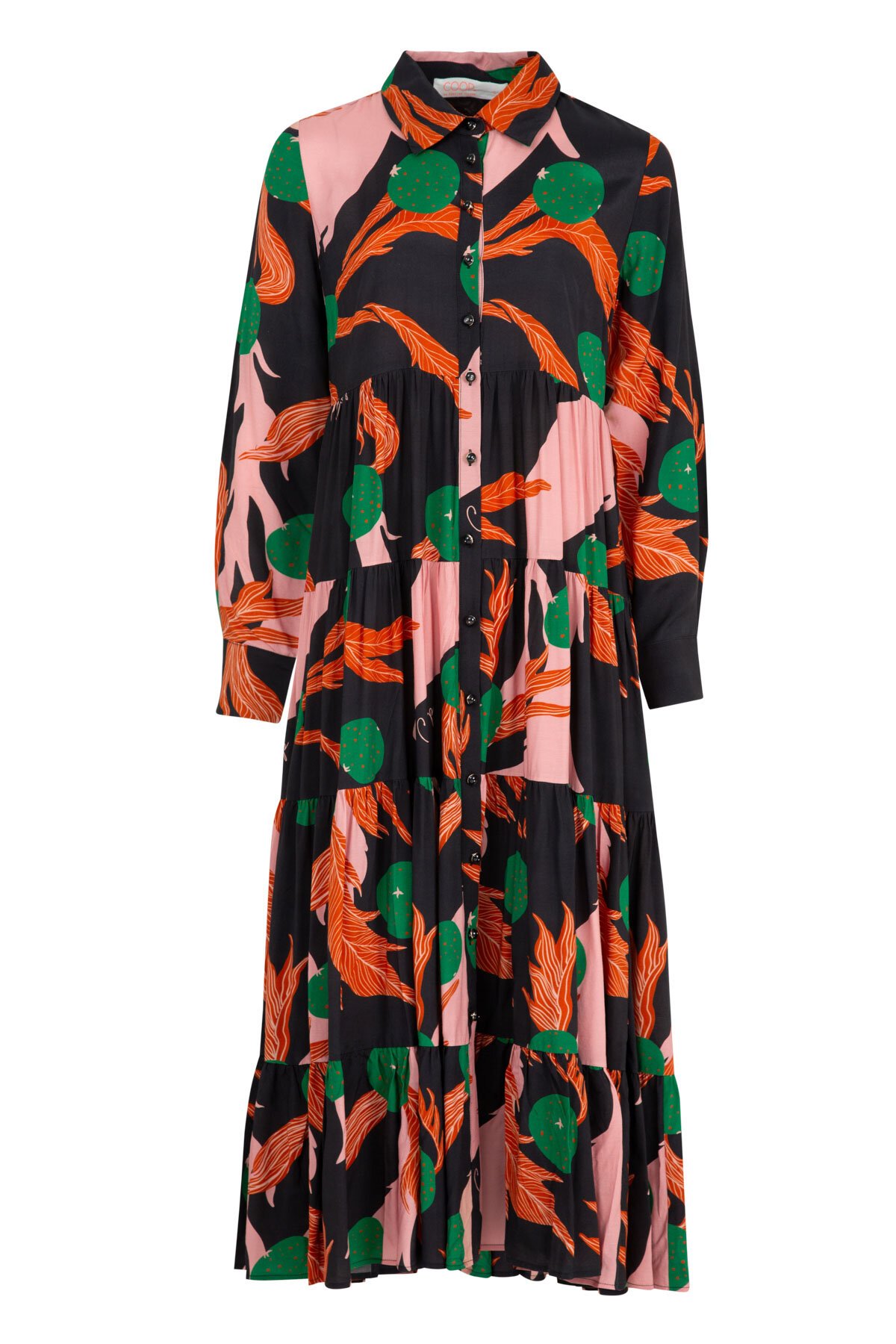 A bold abstract print brings expressive energy to the ‘Sun & the Swoon’ dress, crafted in 'Berry Unexpected' viscose blend. Designed with a button-through front and softly gathered tiers, it features fixed cuffs with button fastenings and practical side pockets, balancing statement style with effortless wearability.