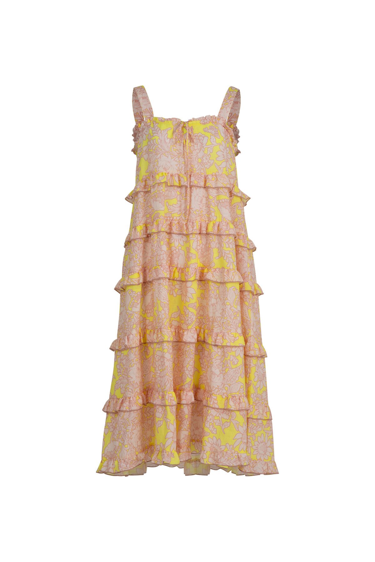 In the vibrant 'Hibis-Kiss' striped ramie, scattered with painterly hibiscus blooms, the 'Top Tier' dress is designed to delight. Ruffles adorn the waist seam, while a drawstring neckline framed in soft ruffles lends versatility and charm. Feminine yet easy, it’s a piece that brings island spirit to every occasion, from long lunches to twilight soirées.