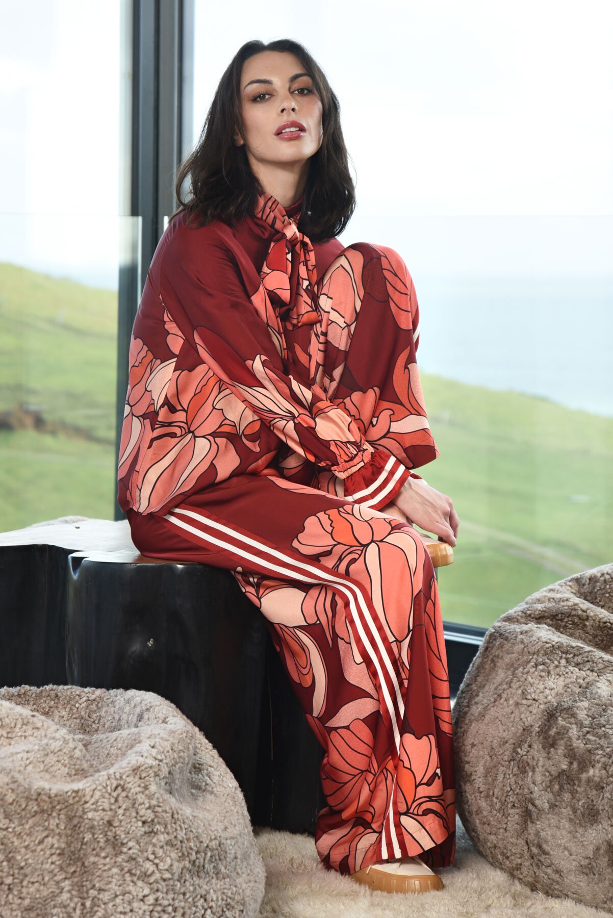 A perfect blend of drama and grace showcasing the ‘Paint the Town Red’ fabrication, ‘A Vintage Top’ shirt features voluminous balloon sleeves and elastic cuffs for a flattering relaxed fit. The notched neckline adds a touch of refined sophistication, while the delicate necktie offers a playful feminine finish. Effortlessly versatile, dress it up with the matching ‘Feeling Leg-endary’ pant or down with your favourite jeans, ideal for both day and night.