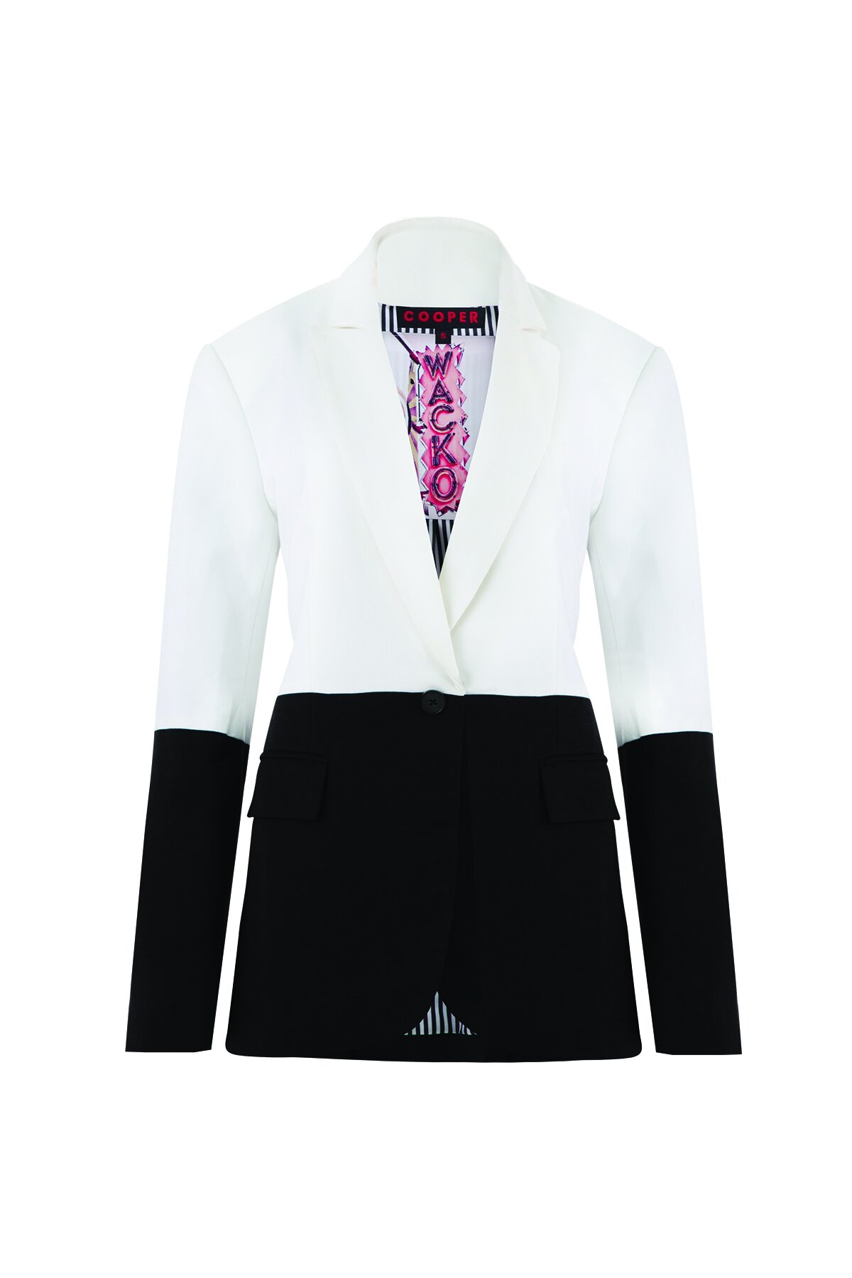 Crepe SuitingOn the cover of this season’s rangebook. The ‘Blazers Edge’ jacket from Cooper by Trelise Cooper. Contrasting statement blazer jacket designed in crepe suiting. Single breasted with single front button fastening, features front pockets, button sleeves and is fully lined with black and white pinstripe lining. Wear with denim or over the ‘Pocket Rocket’ shirt.
