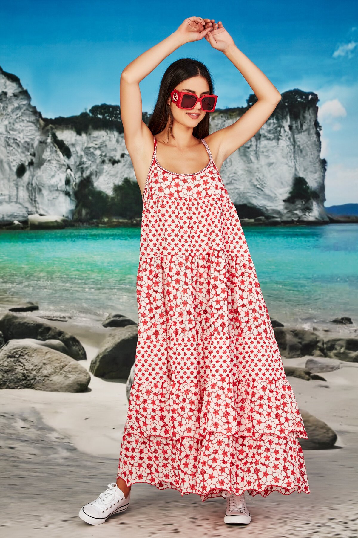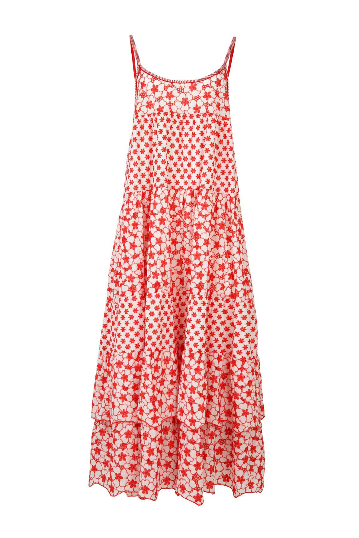 Designed in the 'Make Your Daisy' cotton embroidery fabric. Featuring a statement tie at the back, strap sleeves, and tiers throughout. Ideal for summer days out and can be worn with a jacket in cooler evenings.