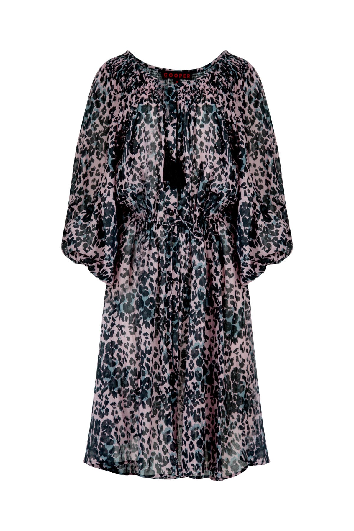 Designed in 'Tickled Pink' printed ramine fabric in pink leopard print. This beautiful mid-length dress features a tassel tie on the versatile elasticated neckline for an optional off shoulder look. With buttons down centre, it can be worn as a dress or open kimono over the top of summer outfits for a bohemian style outfit.