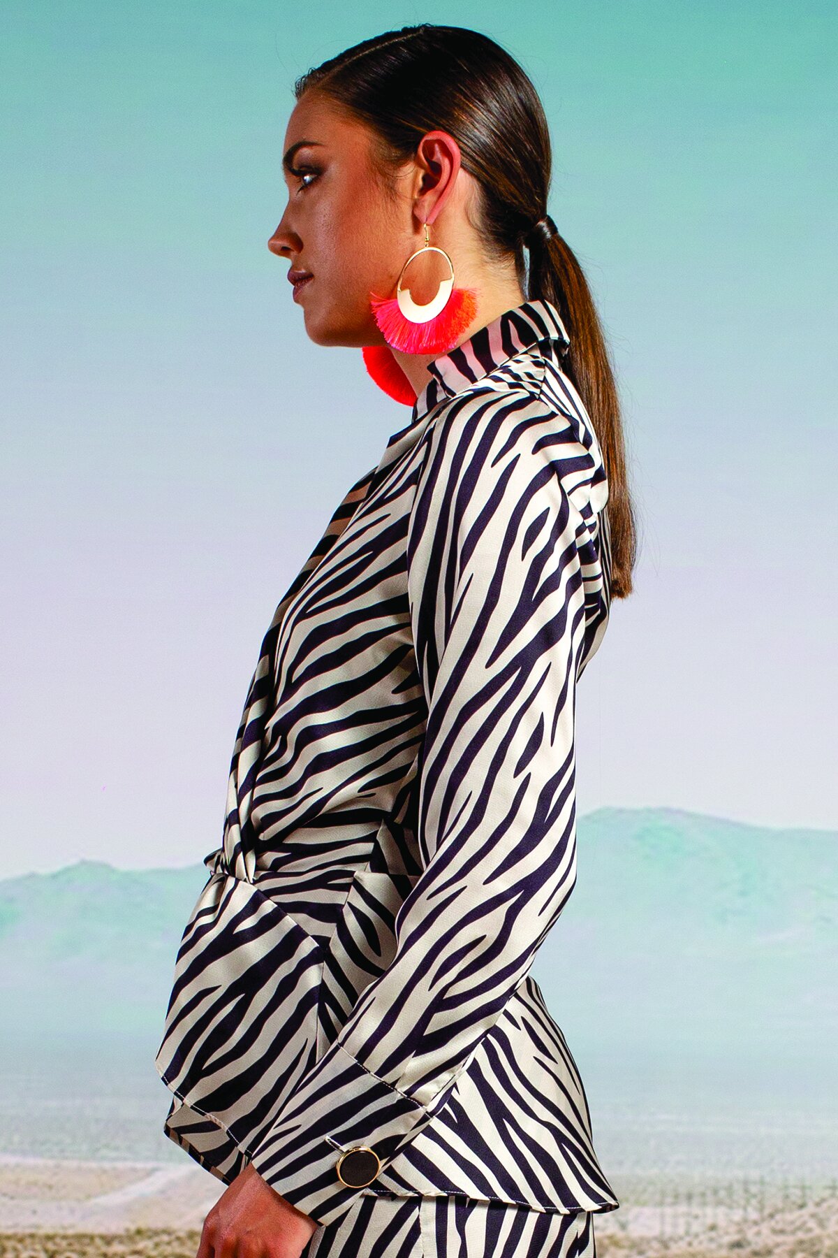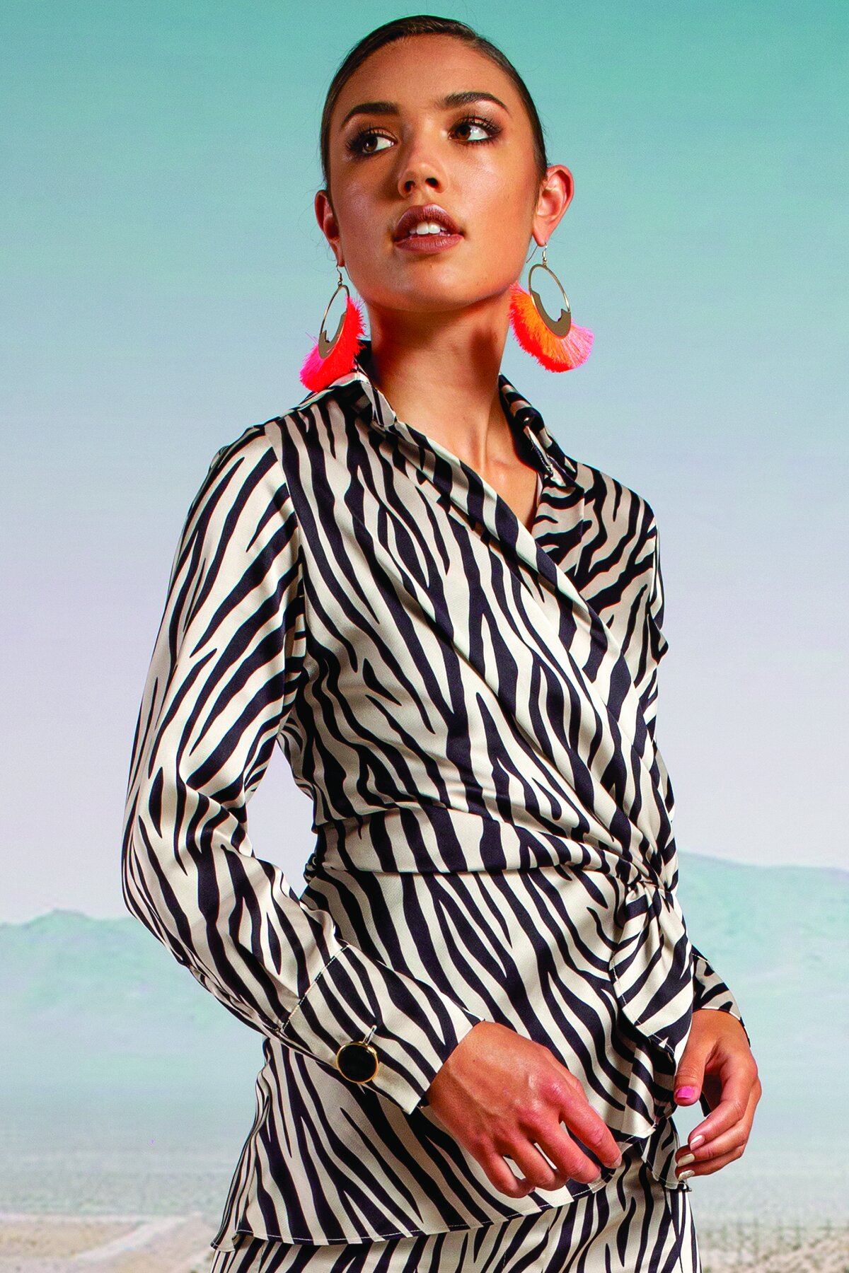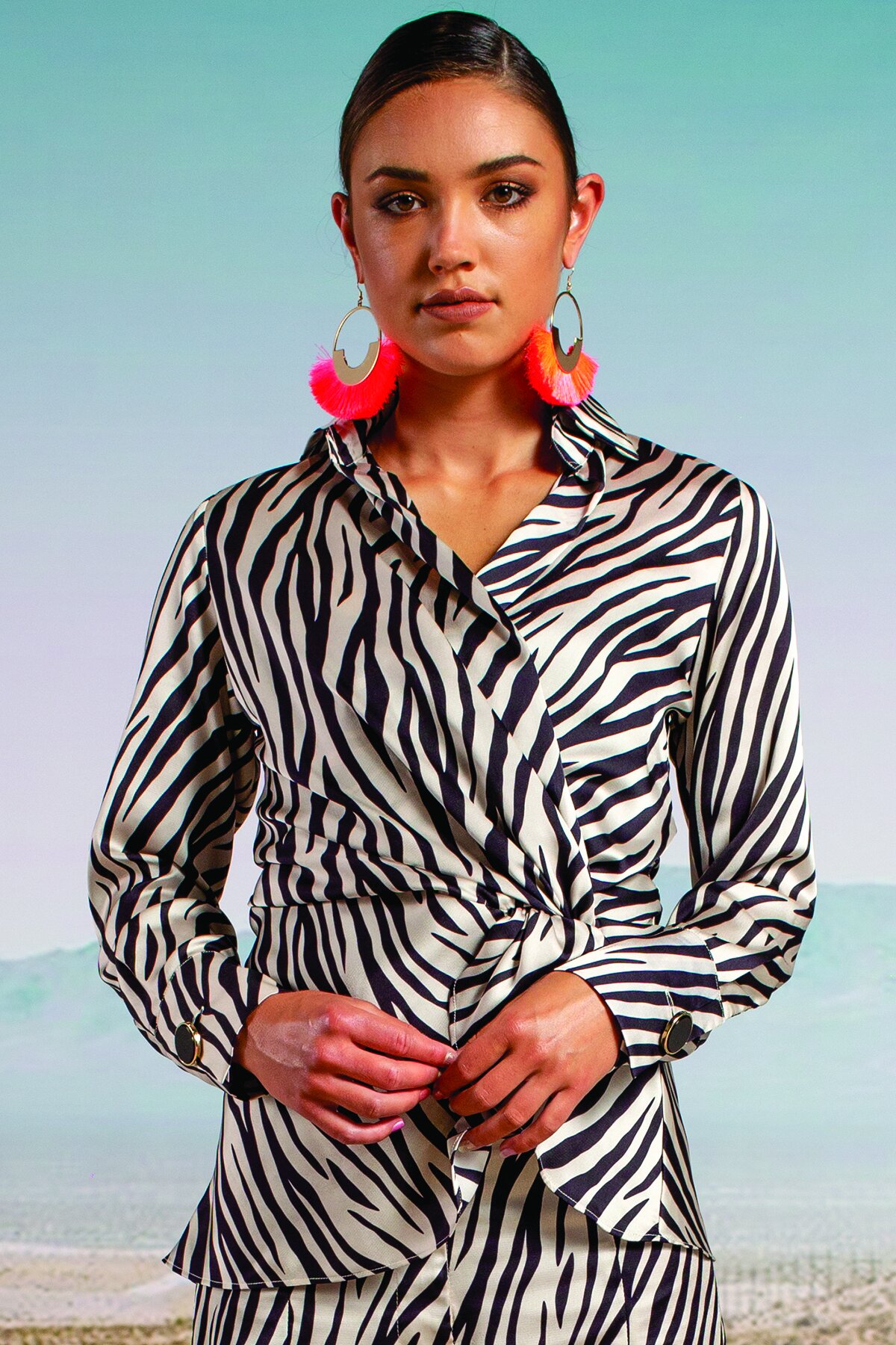 A timeless animal print shirt with flattering cross-over waist. Designed in ‘A Dazzle Of Zebras’ luxurious printed satin. Make a statement and wear with the matching ‘Shake A Leg’ trousers.