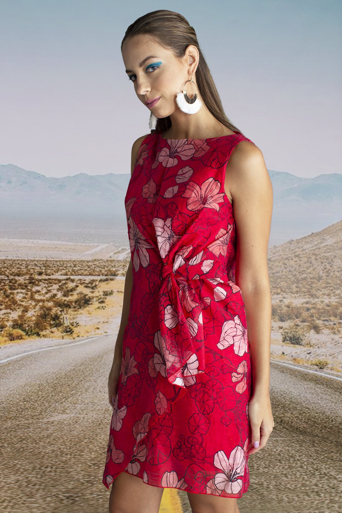 LIVE LIFE IN FULL BLOOMThe 'Cupids Bow' dress from Cooper by Trelise Cooper. Designed in the 'Live Life In Full Bloom' red and pink floral printed viscose linen. A stunning, knee-length dress in ultra-flattering cut with twist detail at the front side waist. Features boat neck and asymmetric scarf hem.