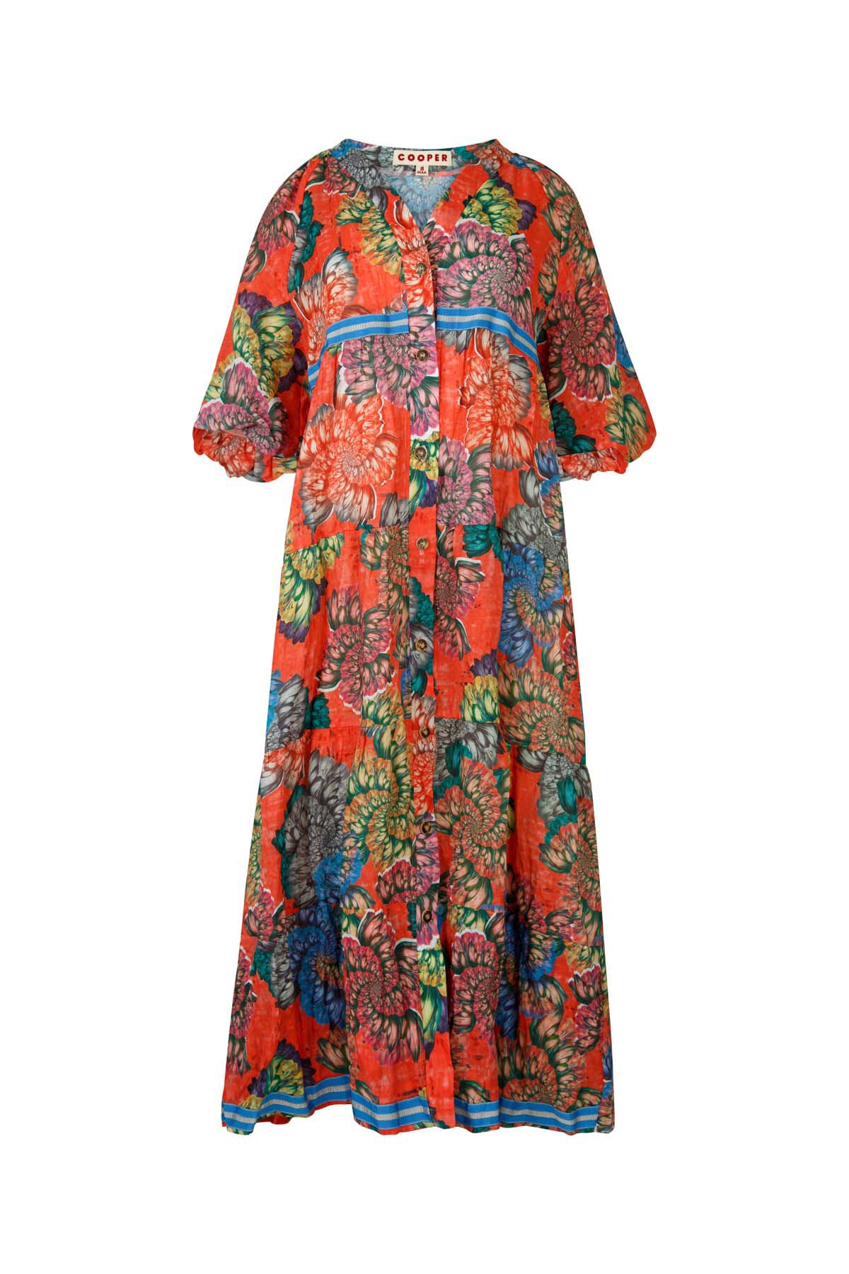 Designed in the 'Here Today, Gone To Maui' 100% ramie printed fabric. Featuring short puff sleeve, V-neckline, blue ribbon hem and buttons from neck to hem. Can also be worn open on top of other garments, or as a dress. Vibrant print can be worn from summer days to nights.
