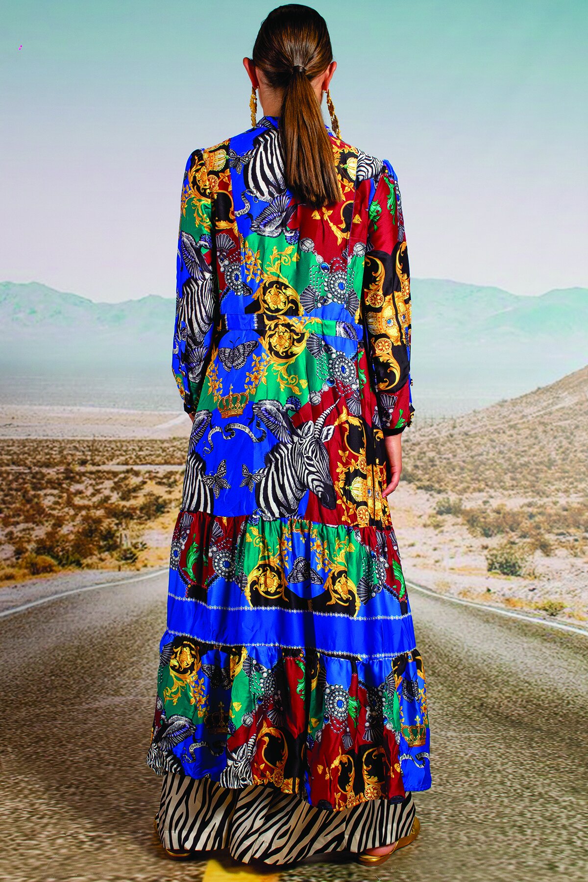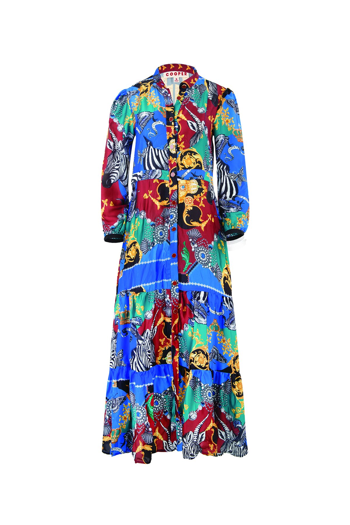 The ‘Long Way To Love’ maxi shirt dress from Cooper by Trelise Cooper. Designed in ‘Jewelling Zebras’ soft twill fabric. This dress features button through front, Chinese collar, black trimmed cuffs and tiered skirt. Wear open as a lightweight coat.