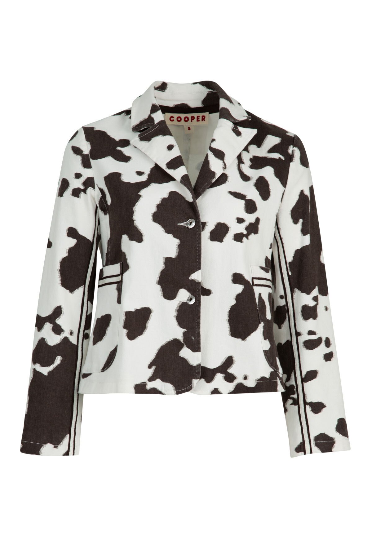 Boldly reimagined, the ‘Suits Her’ jacket pushes the boundaries of modern cool. With a sharp notched lapel, logo patch and striking contrast grosgrain trimming, it fuses rugged Americana with sleek, contemporary tailoring. Boasting the ‘Set the Moo-d’ stretchy denim fabric, it offers unexpected ease, while the standout print makes it an instant statement layer.