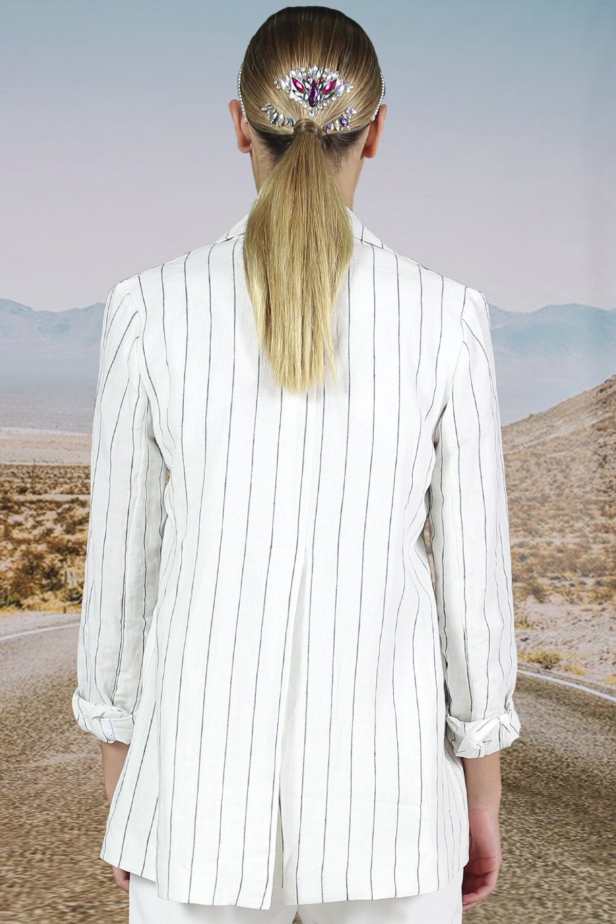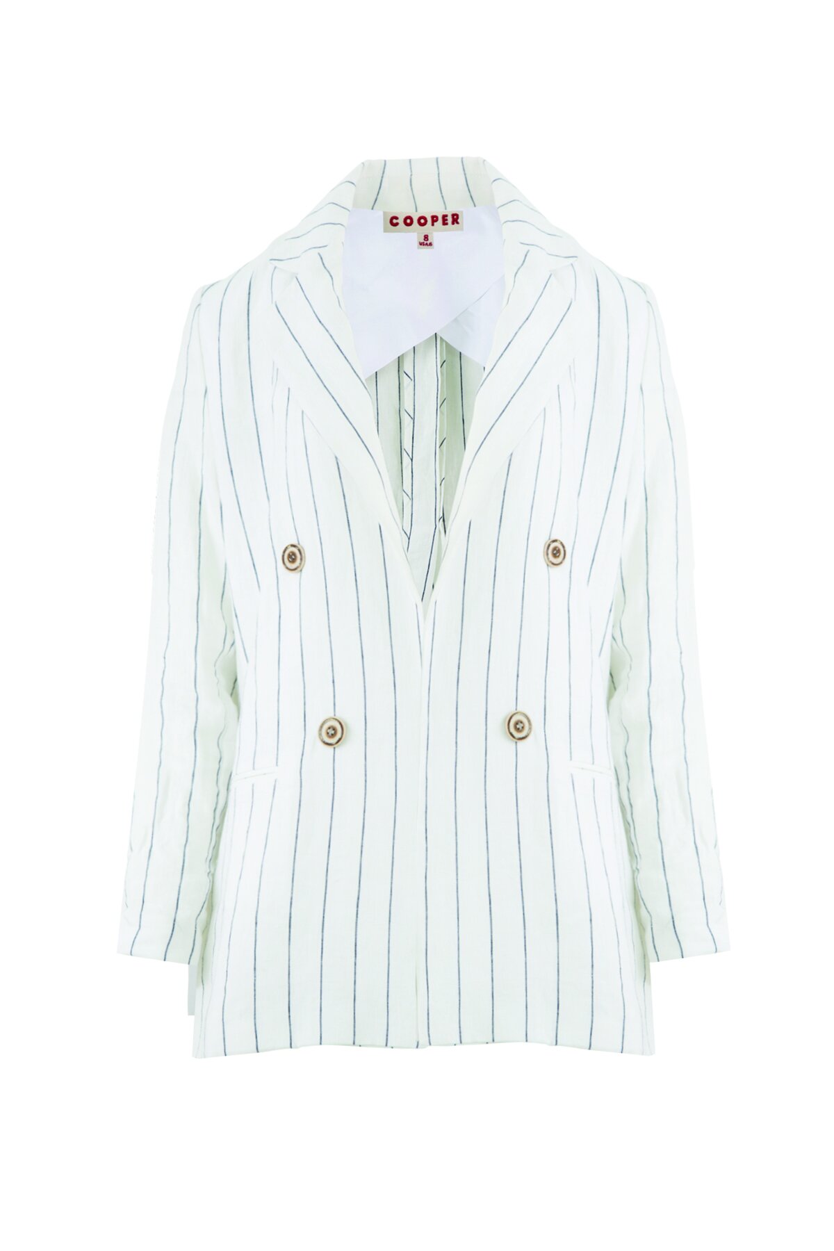 Part of the 'Linen Woman' collection in a classic pinstripe. A beautiful everyday relaxed linen blazer with split back hem and belt detail on the inside of the jacket used to create different ways of doing this jacket up. Wear as a suit with the 'Button Me Up' trousers.