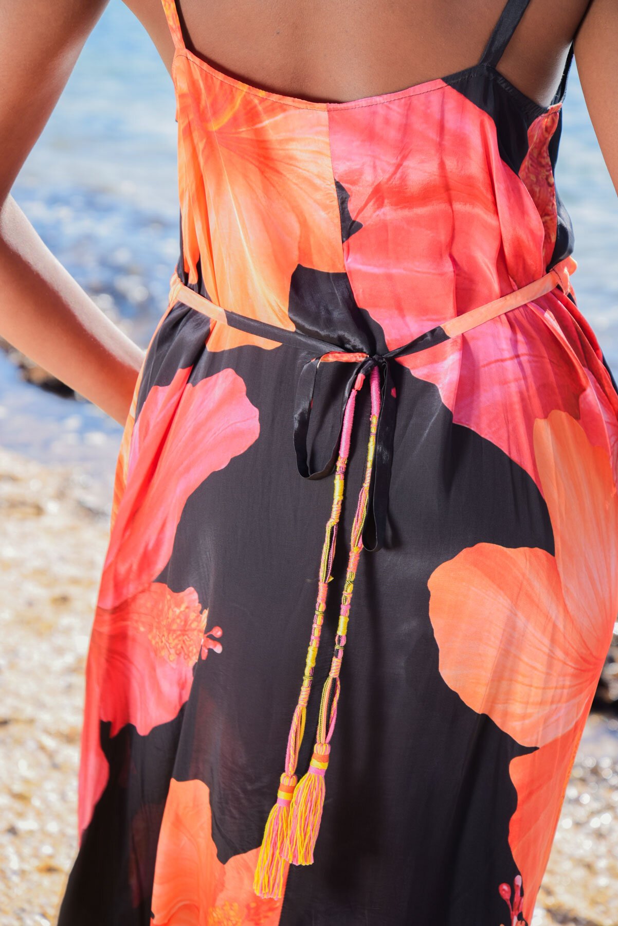 Blooming hibiscus and a bold colour palette come together in the ‘Chain Reaction’ dress for a perfectly summer look. Crafted in the lightweight viscose satin ‘Bloom Town’ fabric, this dress sports a fluid fit with a flattering V-neckline that falls to a gathered, elasticated waist. Complete with self fabric ties trimmed with a bold tassel embellishment to be tied at the back or left loose at the sides, this dress makes holiday dressing a breeze.