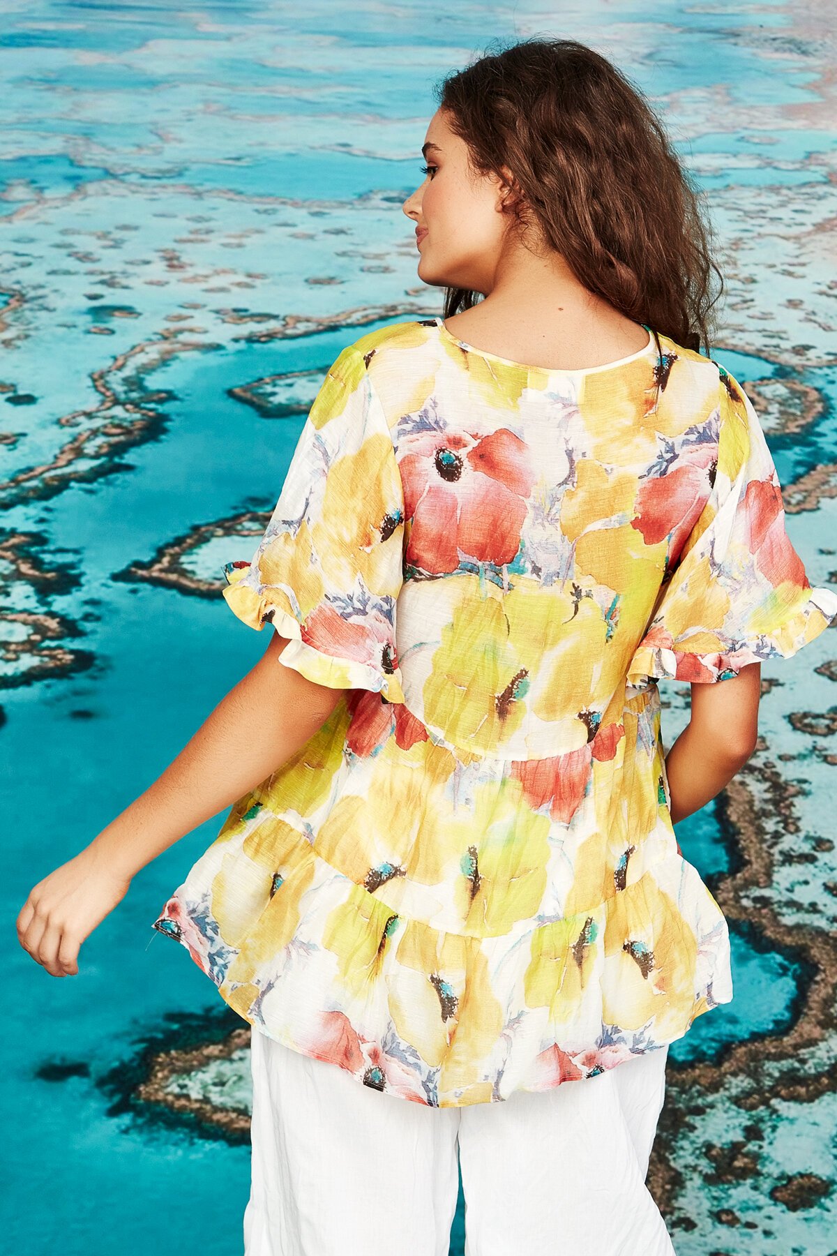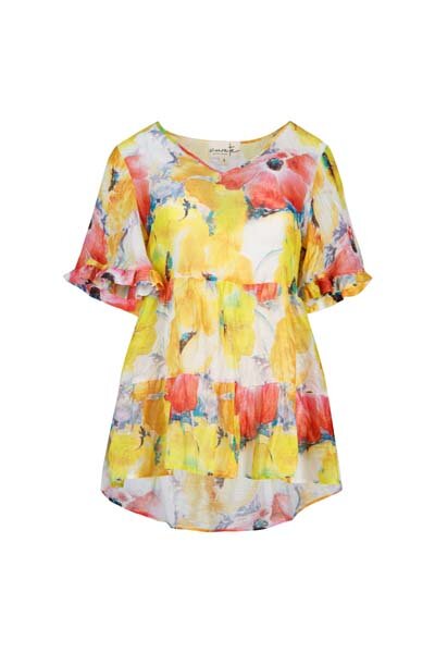The perfect thigh length top to romanticise a simple pair of pants. The 'NOT FOR LONG' top is two-tiered, the first touching under the bust, the second creating a deep frill hem, wide V-neckline, a short sleeve with a frill trim complete this top.