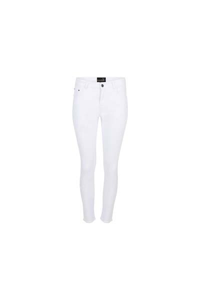 White stretch jeans are embellished with varying sized pearls on both side seams for a touch of elegance. A low rise jean with belt loops and a raw hem finish.