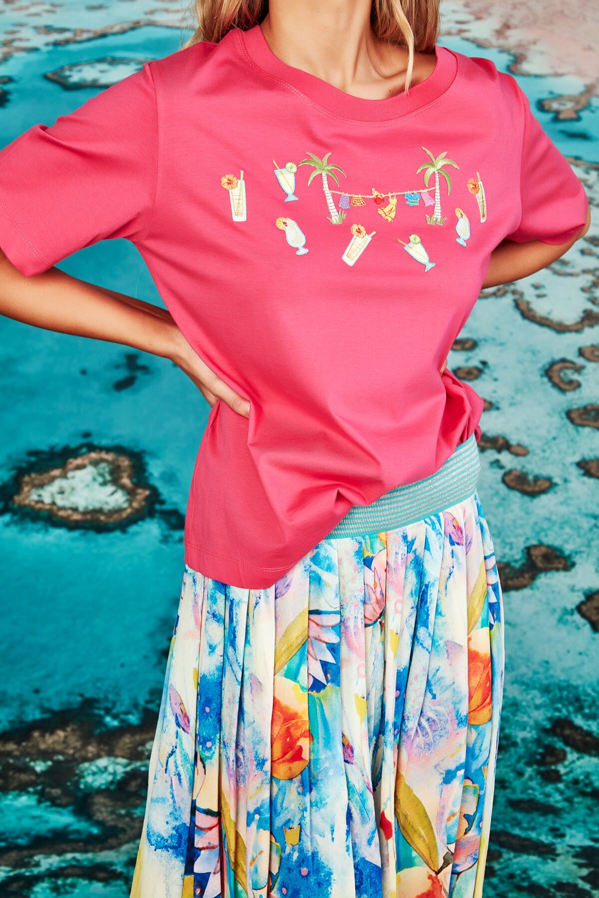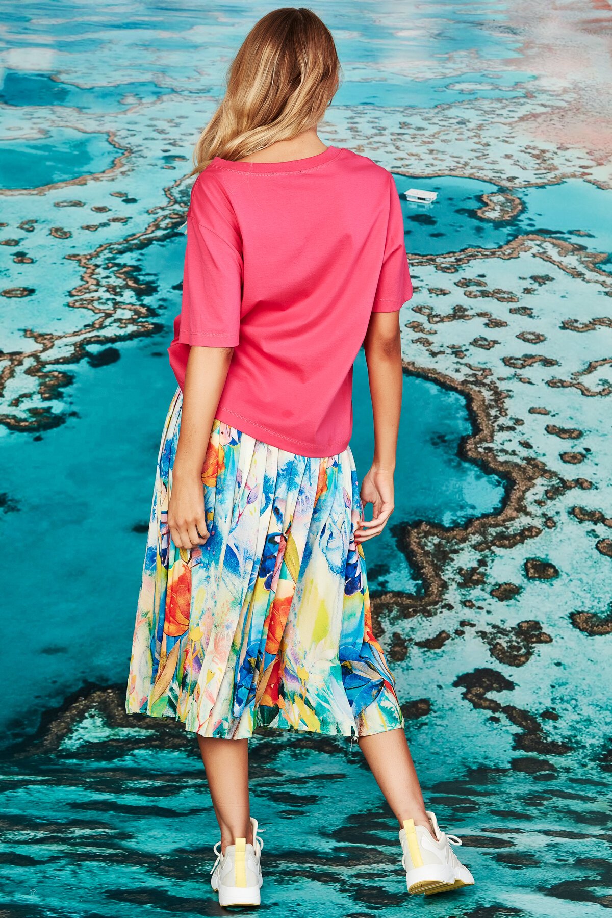 A striped elastic waistband creates the perfect contrast for this summer floral soft pleated skirt 'PLEATY BABY' from Curate by Trelise Cooper. Oversized lily print with a blue base with bold coloured flowers in Viscose. French tuck in a tee to expose the waistline or cover completely, your choice as both work perfectly.