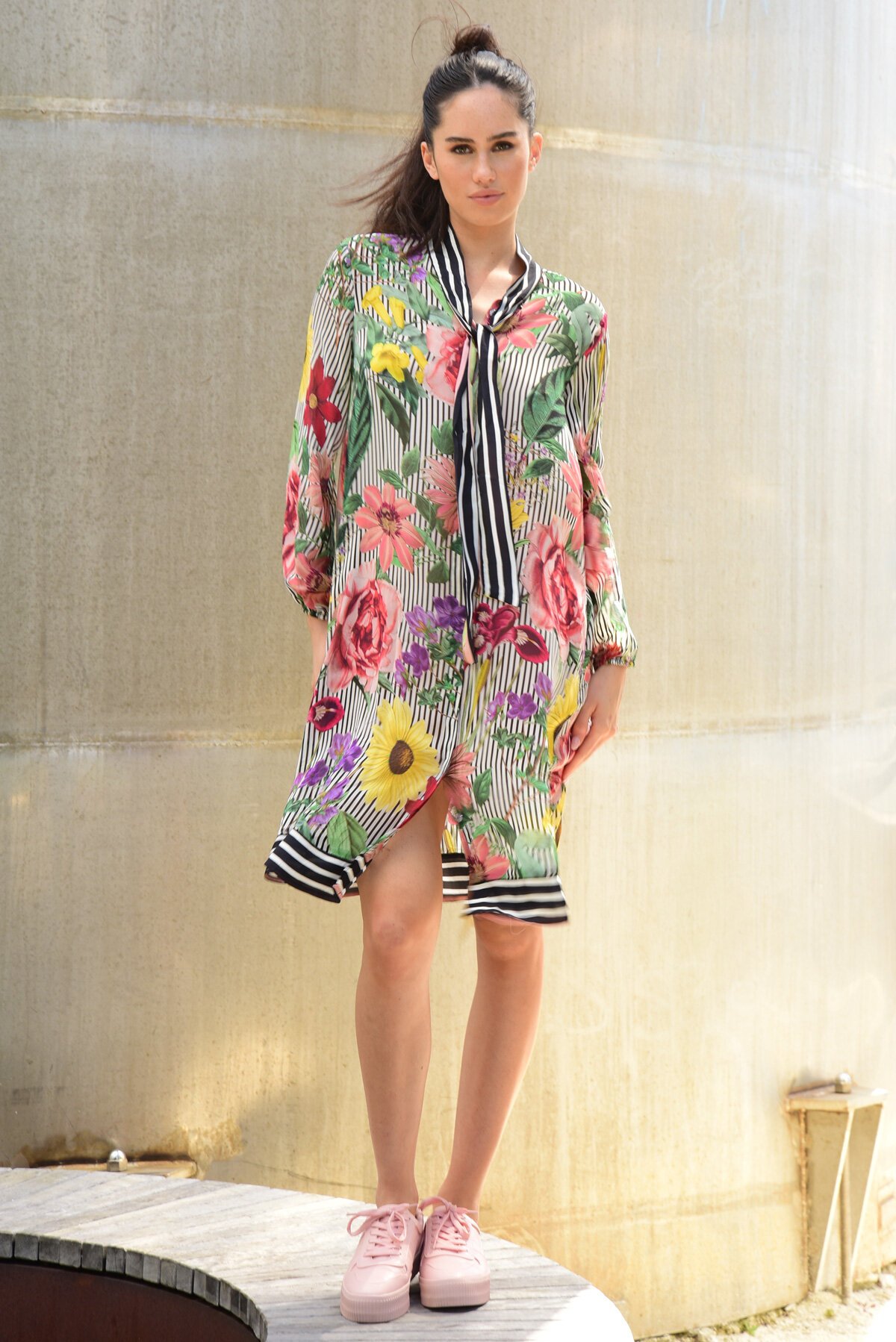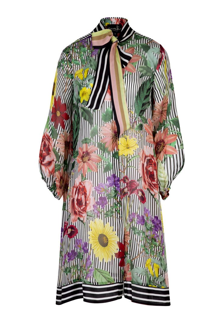 Think layering with the 'Layer Player' dress designed in the ‘Mother Nature’ striped floral viscose georgette. This dress features billowy sleeves, a button down bodice and a pussy bow neck tie. Wear as a dress or switch it up as a light layer over a t-shirt and jeans.