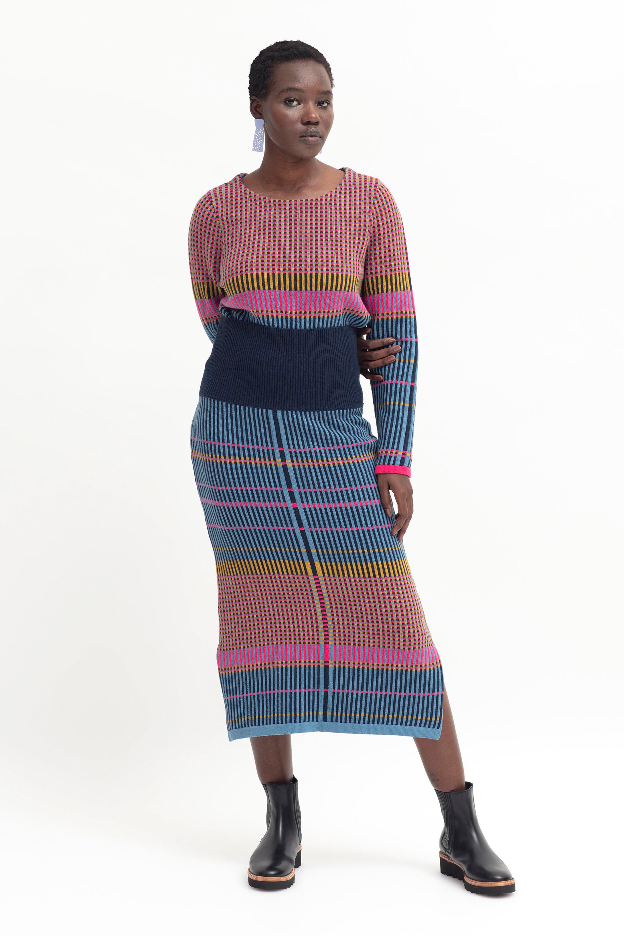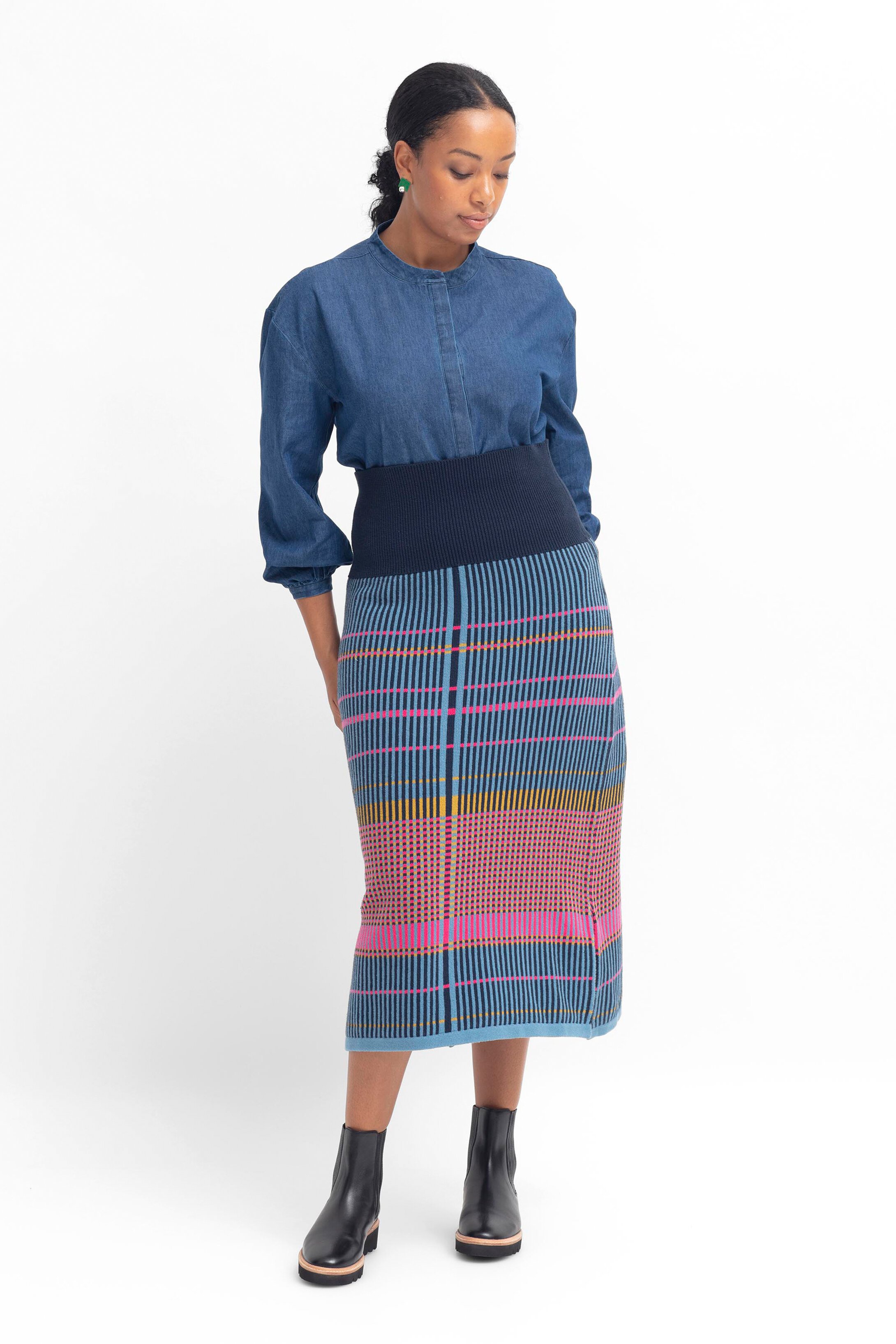 The Cila Knit Skirt is a straight skirt in a multi-coloured check knit design, with a wide rib waistband that can be worn extended or folded down. There are also side splits at the hem for ease of movement.