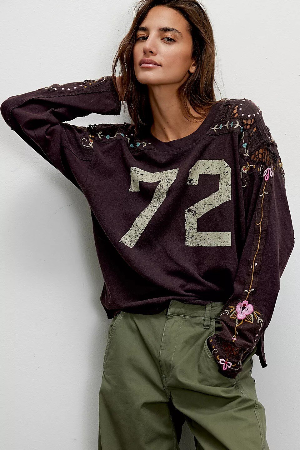 Features: Soft cotton fabrication, scoop-neckline, drop-shoulder sleeves, contrast embroidered detailing, oversized number graphic, defined seams throughout
