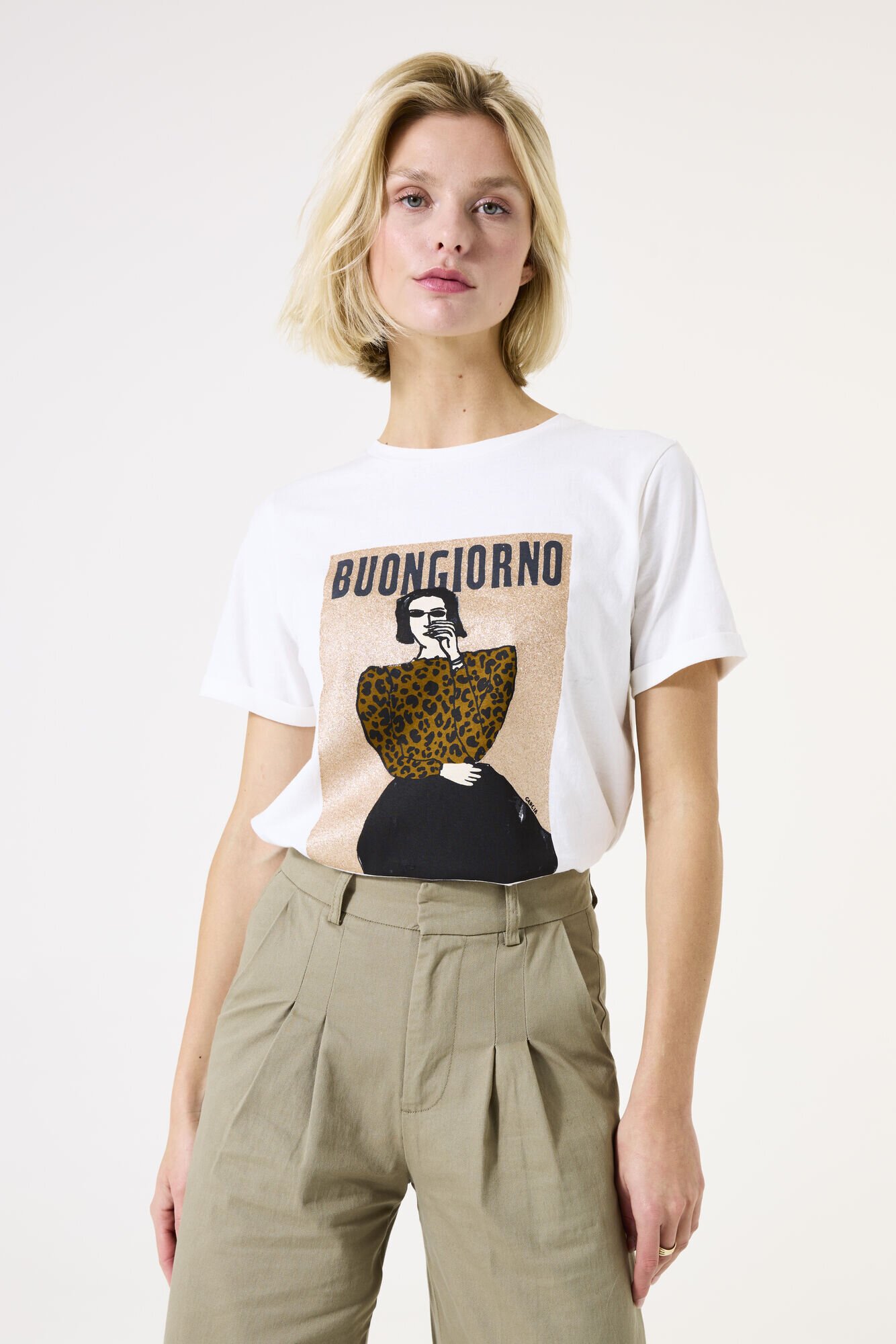 Stylish T-shirt with a striking chest print. This T-shirt features a round neck, short sleeves, and a relaxed fit. This item is made of 50% cotton and 50% recycled cotton.