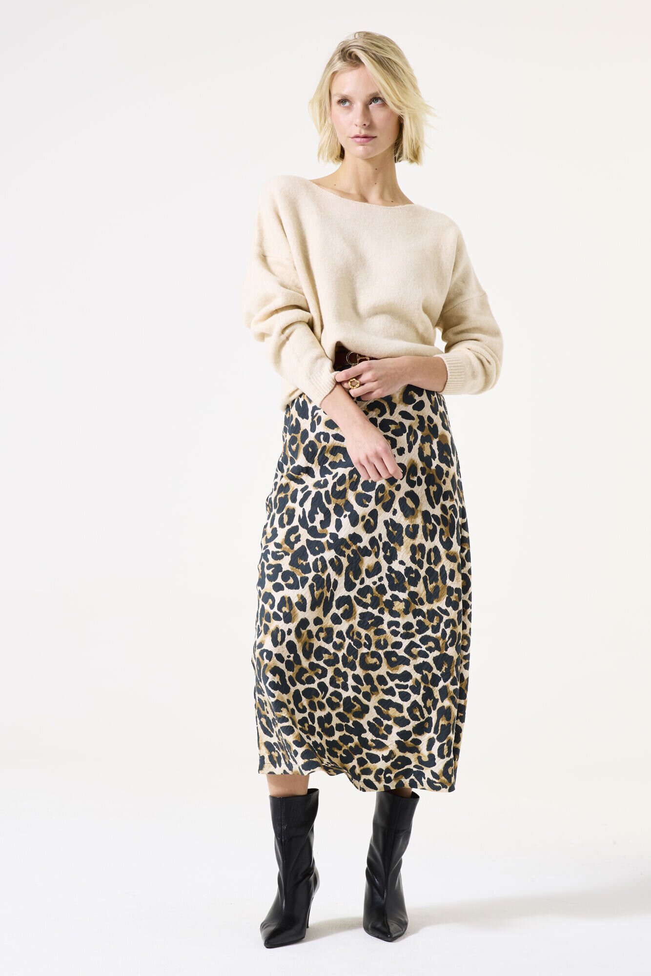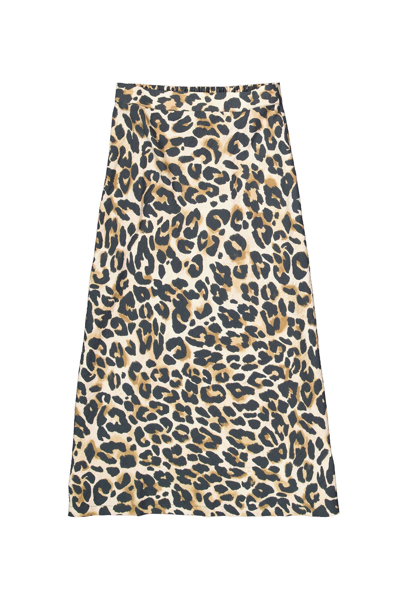Leopard print skirt made of a trendy crinkle fabric. This skirt features a high waist, an elastic waistband, and a regular fit. This item is made of 88% viscose and 12% polyamide.