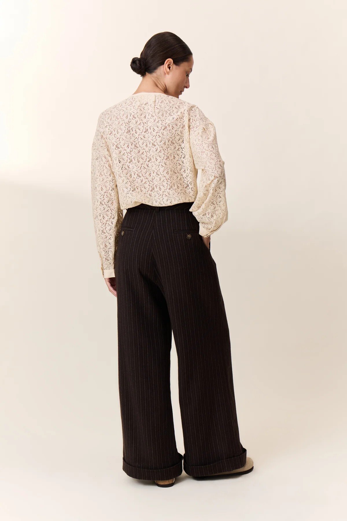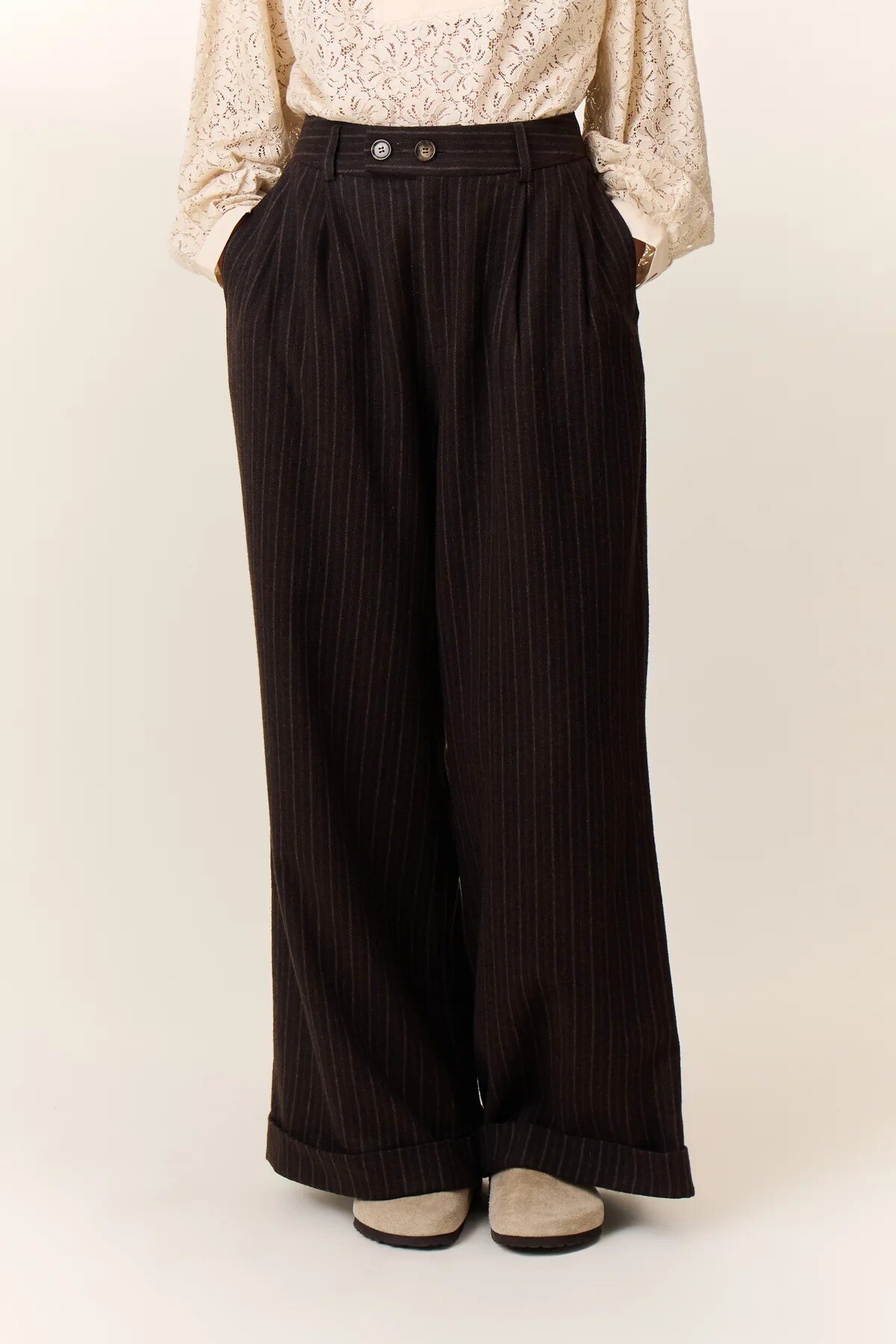 The Popsi Stripe trousers offer a bold silhouette designed to combine comfort and style. The structured wide cut features pleats at the front that shape the volume while maintaining a fluid drape. The fine vertical stripes add dynamism and elongate the leg, enhanced by the high waist with visible buttons. A cuff at the hem perfects the line. This model pairs easily with a blouse or a fine sweater for a relaxed urban look.