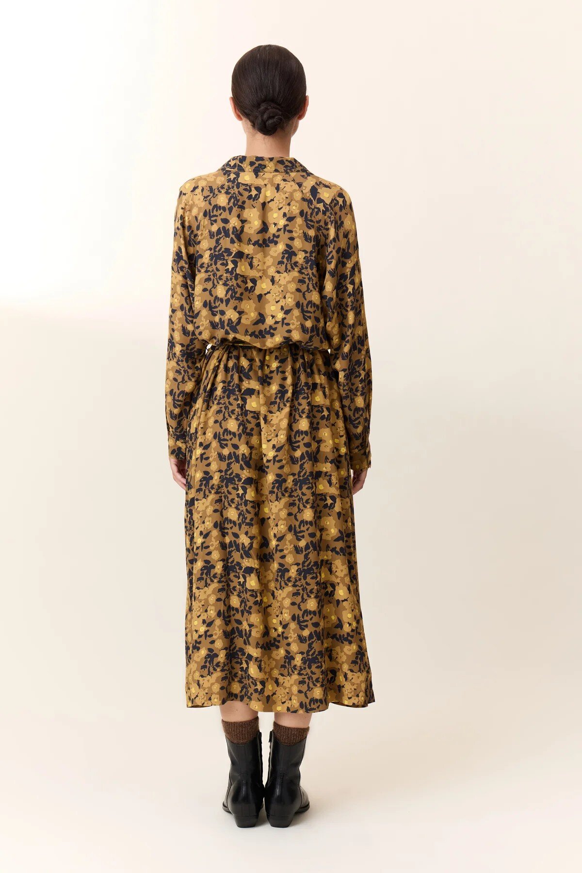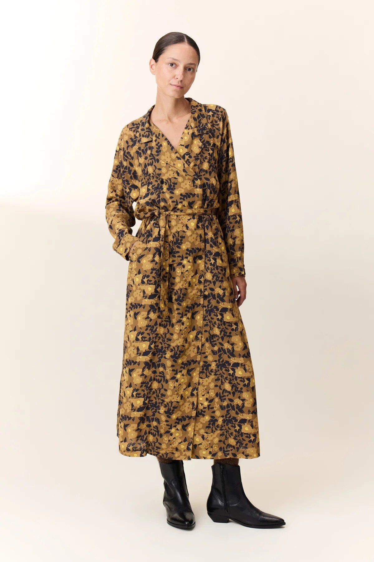 The Reda Flower dress offers a retro-chic interpretation of the feminine silhouette with a midi cut and floral print. The shirt collar, structured by a buttoned wrap closure, highlights the precise craftsmanship of the finishing touches. The long sleeves, featuring buttoned cuffs, and the tie belt enhance the freedom to adjust the piece to your style. Ideal with boots for a signature look.