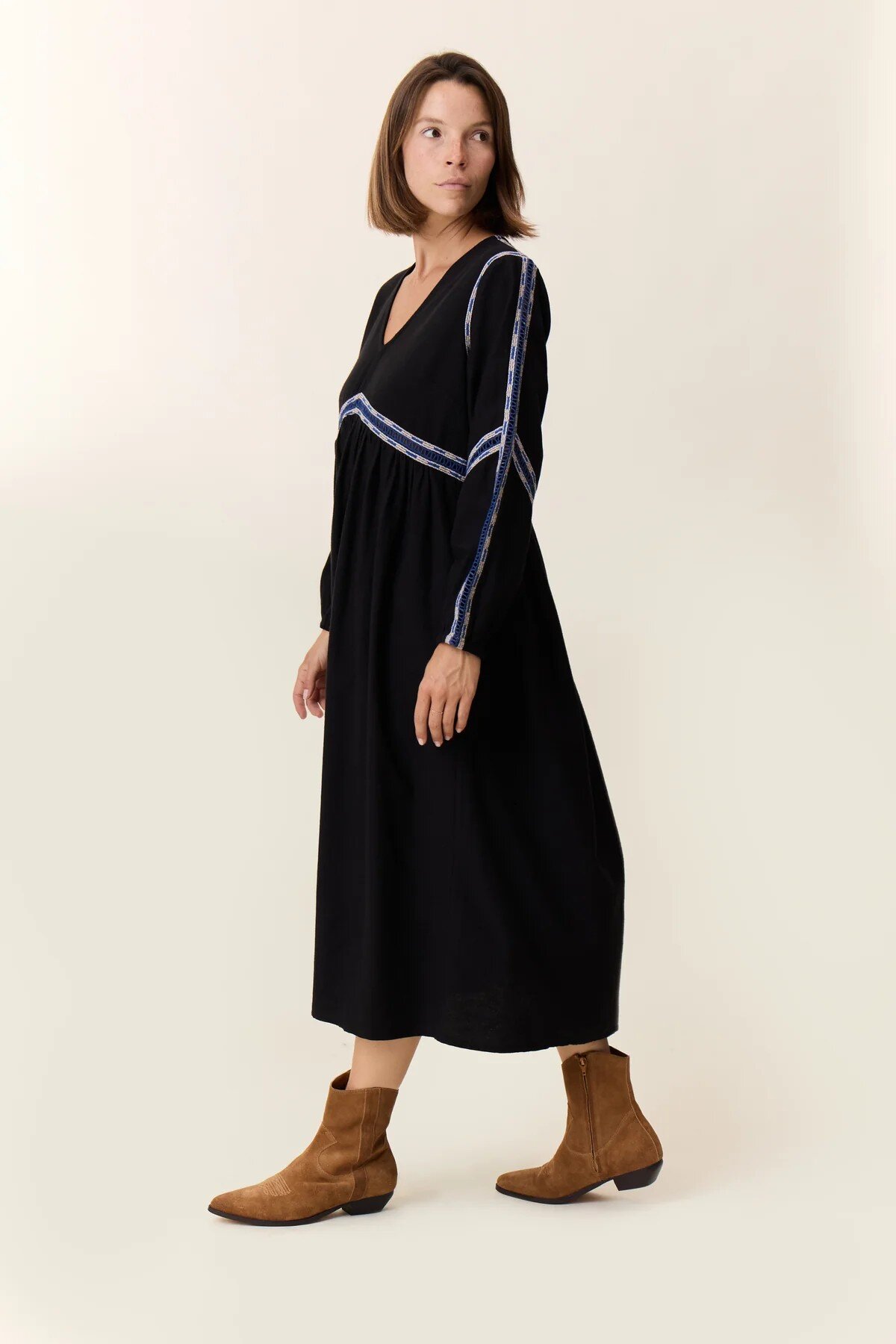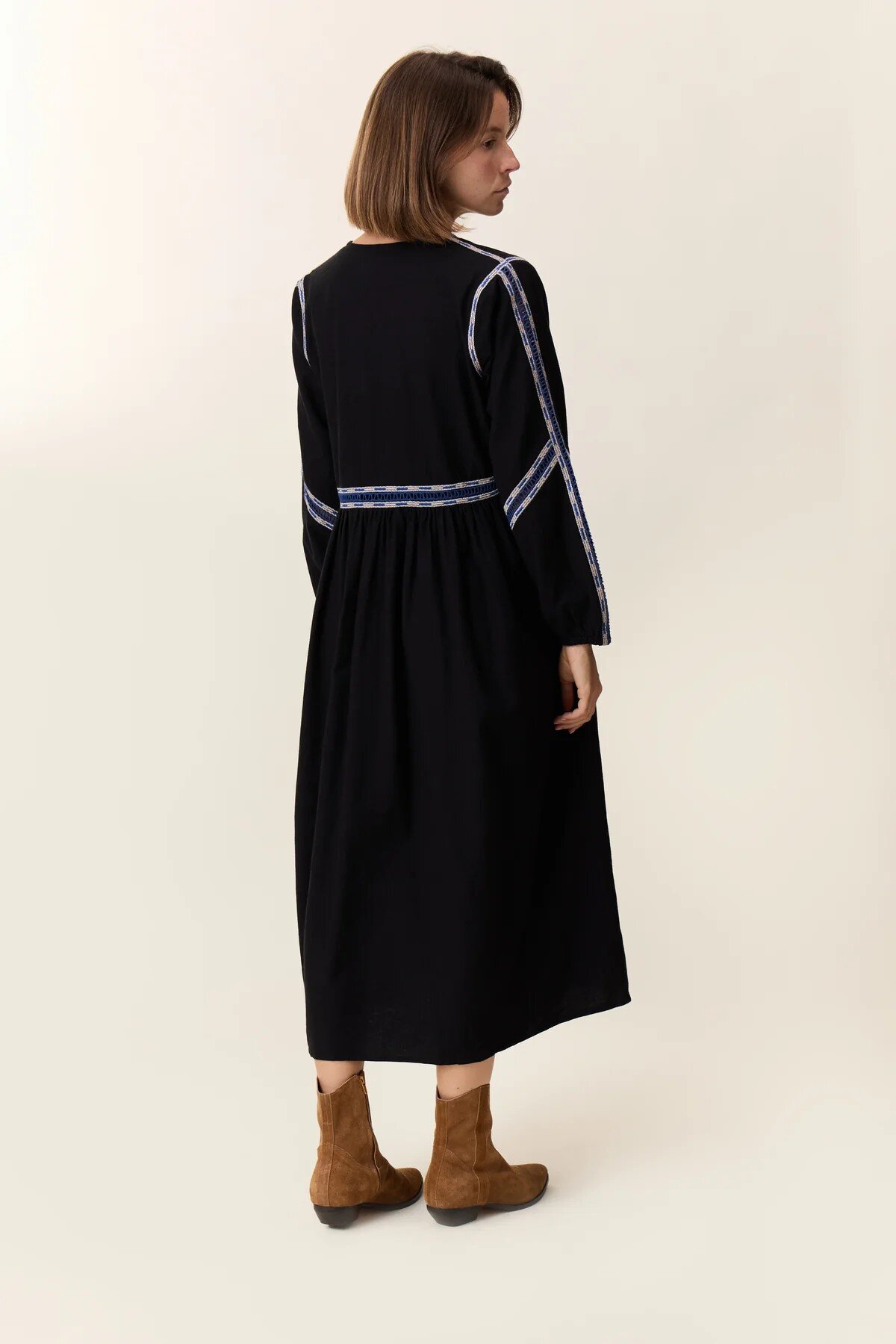 The Reeta Lad Dress expresses the signature spirit of Leon & Harper, energized by a midi cut and a V-neckline. The long sleeves are highlighted with embroidered bands featuring geometric patterns, continuing onto the bodice for a distinctive graphic effect. The gathered waist ensures a fluid drape and subtly shapes the silhouette. This model fully embodies the brand's DNA, paired with structured boots or summer sandals.