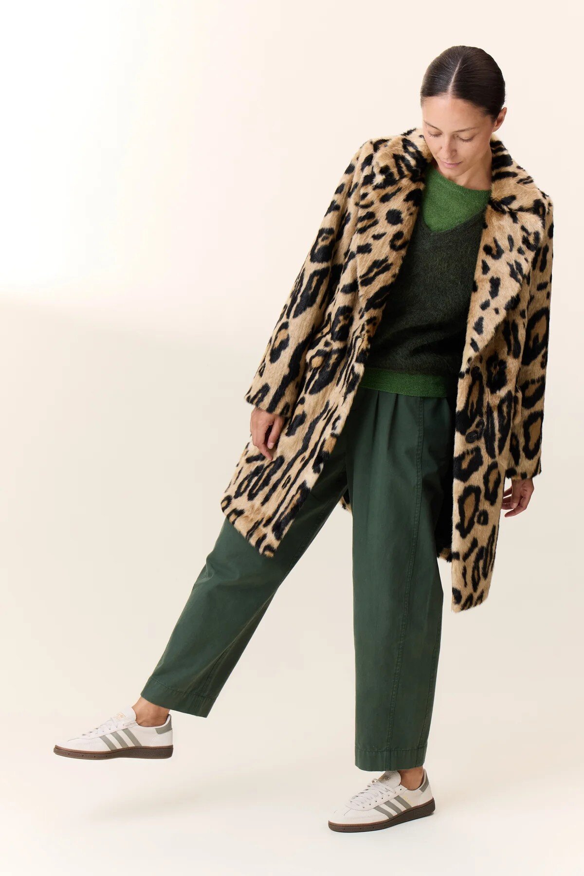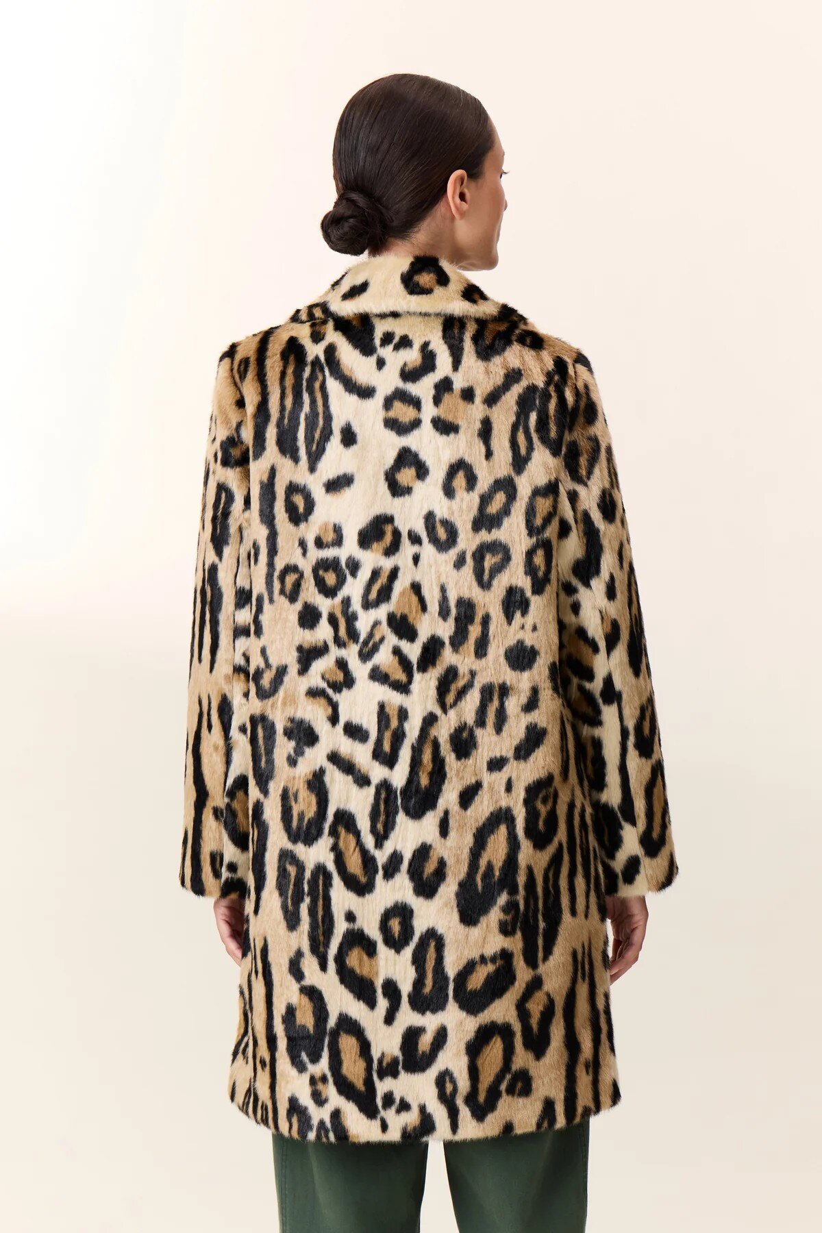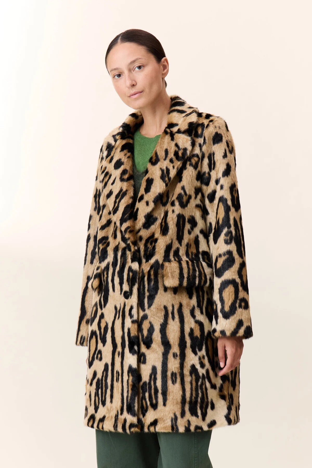 The Volf Leo coat features a bold animal print, a hallmark of urban style. The length shapes the silhouette while maintaining freedom of movement. The timeless notched collar and seamlessly integrated side pockets are appreciated. The finishes are precise, the texture feels soft to the touch, and the button closure enhances the practical nature of the piece. Ideal with plain trousers or a dress to vary styles.